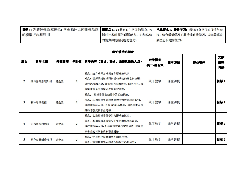 《3D动画制作基础》教学大纲裸寇名称,3D动画制作基础课忍类别(必修选修)事选修课程英文名称:总学时周学时学分,3222其中实险实戒学时,16先继课塞:后续课程支推授课时间:2至17周星期二34节餐裸地点:605机房提课对律:2022多媒体1班开裸学洗:粤台产业科技学院任课就师姓名淋:吴添/高级工程师答展时间、地点与方式:1每次课的课前、课间和课后,采用一对一的问答方式:2每次习愿课,采用集中讲解方式。课座考拔方式:开卷()闭港《)课程论文()其它《√)非试港类报告1·使用微村:《ya三维动画制作基础教程》(第一版)作者:王楠2011年,人民邮电出版社。ISBN编号:9787115250612课寇情介:1.动画基础原理介绍:课程开始于介绍动画的基本原理,包括关键帧动画、缓动曲线、物体运动路径等基础概念,帮助学生建立对动画制作流程和基本规律的认识。2.物体运动模拟与引力效应:学生将学习如何模拟物体在动画中的运动轨迹和速度变化,包括引力、摩擦力等物理效应的模拟和应用,使动画中的物体运动更加真实和自然3.角色动画制作技巧:课程重点讲解角色动画制作的技巧和规律,包括人体运动学原理、骨骼绑定、动作捕捉等方面的知识,以及如何通过这些技巧制作生动的角色动画