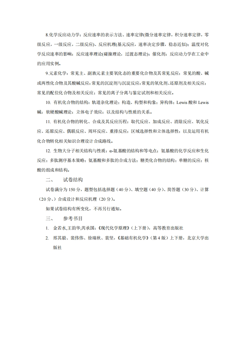 一、考试内容范围本科目考试主要考察考生对现代化学有关物质结构、物态变化、有机化合物(包括重要生物大分子)的制备,转化及其反应历程、反应热力学和反应动力学等基本知识的掌握情况,以及分析与解决实际问题的能力。主要考察范围包括:1.物质存在状态及其相互转化:理想气体状态方程、道尔顿分压定律、实际气体(范德华方程):气体的液化(临界温度)、液体的蒸发(蒸气压,沸点,克拉佩龙克劳修斯方程):凝固和熔化、升华和凝华、相图、相律、相图的用途:溶液浓度的表示方法、固体在液体中的溶解度、气体在液体中的溶解度(亨利定律):稀溶液的依数性。2物质结构:原子的量子力学模型、多电子原子的结构与周期律、元素性质的周期性变化规律:价键理论、分子轨道理论、分子的空间构型、分子间作用力:晶体的种类、晶系、晶胞结构。3化学反应热力学与化学平衡:基本概念(体系与环境,状态函数,过程和途径,内能,热和功):热力学第一定律、热化学方程式和盖斯定律、反应焓变的求算:熵和熵变,热力学第二定律:自由能和自由能的变化:化学平衡理论、平衡常数(气相反应,气固相反应,溶液反应)、平衡常数和自由能的变化:多重平衡、影响化学平衡的因素:气相反应的化学平衡计算、相平衡相关计算:反应热力学在工业中的应用实例。4.酸碱平衡:酸碱理论、水的自解离平衡、强酸和强碱的水溶液:酸碱在水溶液中的相对强度(弱酸的解离常数,弱碱的解离常数,拉平效应和区分效应,影响酸强度的主要因素):弱酸弱碱的电离平衡(一元及多元弱酸/碱,酸式盐,氨基酸及其等电点):酸碱电离平衡的移动、酸碱指示剂、缓冲溶液:酸碱滴定。5.沉淀溶解平衡:溶度积、溶度积与溶解度的关系:溶解与沉淀过程的判断、影响沉淀-溶解平衡的因素(同离子效应,盐效应,酸效应)、沉淀的溶解与抑制、离子的选择性沉淀、沉淀的转化。6.配位化合物和配位平衡:配位化合物的组成、类型、命名、结构:晶体场理论:配位平衡及平衡常数:配位化合物的应用。7.氧化还原反应与电化学:元素的氧化数:半反应与氧化还原方程式:原电池中电极的类型、电极符号和电池符号,电池的电动势和电极电势:电池电势与自由能变化及平衡常数的关系、能斯特方程:浓差电池、影响电极电势的因素(浓度,酸度,形成沉淀,形成配离子)、氧化还原平衡计算:元素电势:氧化还原反应的应用。