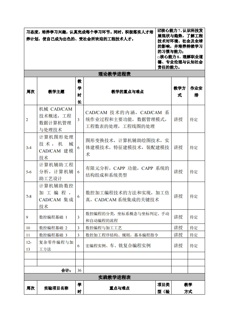 《CAD/CAM技术基础》课程教学大纲课程名称:CAD/CAM技术基础课程类别(必修选修):选修课程英文名称:CAD/CAM Technology总学时/周学时/学分:54/33其中实验/实贱学时:18先修课程:机械设计、机械原理、电工电子授课时间:2至19周,周五1-3节授课地点:精雕实训基地授课对象:2017精密制造1班开课学院:粤台产业科技学院任课教师姓名职称:吕杰融副教授答疑时间、地点与方式:上课前后在上课数室答疑。还可利用网络课程平台随时留言答乘。课程考核方式:开卷()闭卷()课程论文()其它(√)使用教材:《机械CAD/CAM技术》王隆太主编机械工业出版社2017年第4版教学参考资料::各种版本的《机械CAD/CAM技术》教材、习题集及其他辅学材料课程简介:本课程系统地讲述了机械CAD/CAM的基本概念、应用方法和关键技术。主要内容包括CAD/CAM系统工作原理、款硬件支撑环境和支排技术、设计数据处理技术、计算机图形处理技术、CAD/CAM建模技术、机械CAD/CAM应用软件开发技术、计算机辅助工艺过程设计、数控加工编程、CAD/CAM集成技术及其应用等。在内容的安排上,按照设计,分析,工艺和加工4个机械产品主要生产环节,着重介绍计算机在工程图样的绘制、产品几何建模,CAE分析、工艺规划和数控编程中的应用技术。课程教学目标本课程与学生核心能力培养之间的关联(授课对象1、知识与技能目标:为理工科专业学生的课程通过本课程的学习,使学生攀握CAD/CAE/CAPP/CAM的基本概填写此栏):念、应用方法和关键技术。包括初步掌握工程数据计算机管理和处理技☑核心能力1.应用数学、基础科学和机械设计制造术;计算机图形处理技术;机械CAD/CAM建模技术(实体建模技术,及其自动化专业知识能特征建模技术,装配建模技术);初步掌握计算机辅助工程分析技术:计力:算机辅助工艺设计技术以及计算机辅助数控加工编程技术等。掌握☑核心能力2.设计与执CAD/CAM常用的应用软件的操作方法。行机械设计制造及其自动化专业相关实验,以及分2、过程与方法目标:析与解释相关数据的能本课程既要学习CAD /CAM的基本概念、基本方法,同时也要上机力:学习CAD/CAM常用的应用软件的操作方法和建模技术。因此,在学习☑核心能力3.机械工程领域所需技能、技术以及的过程中要理论联合实际。在教学方法上要保留传统散学手段“粉笔+黑实用软硬件工具的能力:板+模型”的合理内核,同时积极开发、利用网络教学资源,形成全方位☑核心能力4.机械工程的立体化的教学手段,从而达到“减压增遵”、“提智扩能”的教学目标。系统、零部件或工艺流程的设计能力;3、情感、态度与价值观发展目标:口核心能力5.项目管理、机械CAD/CAM技术属学科选修课。理论性强,与各类工程技术有有效沟通协调、团队合作着密切的联系,因此处理工程问题的能力是学习该课程学生的必备素质。及创新能力:☑核心能力6.发掘、分析学生应重视本课程在素质培养中的作用,本着对自已、对社会高度负责的与解决复杂机械工程问题态度搞好课程学习。体现在学习中,具体要做到:明确学习目标,端正学的能力;
