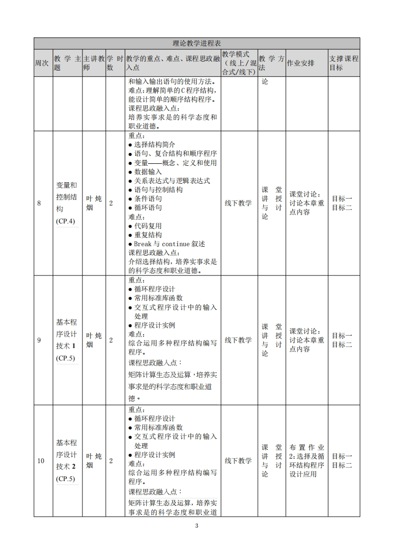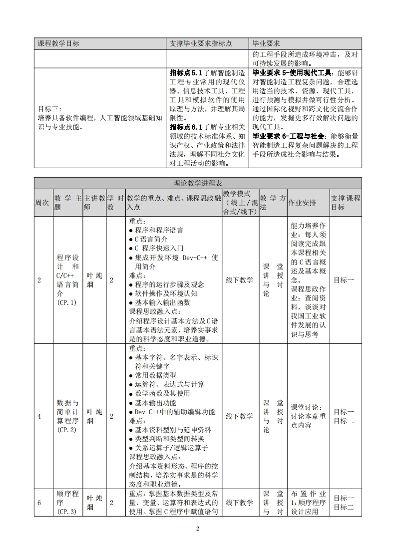 《C语言程序设计》教学大纲课程名称:C语言程序设计课程类别(必修/选修):必修课程英文名称:C Language Programming总学时/周学时/学分:48/3/3其中实验/实践学时:24先修课程:大学生计算机基础概论后续课程支撑:单片机应用与开发授课时间:第2-17周,周四01-02节:第9-16周,周二05-06节。授课地点:实验楼503机房授课对象:2025智能制造1、2班、2025工业设计1班开课学院:粤台产业科技学院任课教师姓名/职称:叶炖烟/教授答疑时间、地点与方式:分配习题演练,采用集中讲解方式课程考核方式:开卷()闭卷(√)课程论文()其它(√)考试+作业使用教材:C语言程序设计(第3版徽课版),徐英藏、李颗、黄宏博、周淑一、方炜炜、李子录,清华大学出版社。教学参考资料:1.C语言程序设计:现代方法(第2版修订版),[美]K.N.Kig,人民邮电出版社·2.线上:C语言教程https:/www.runoob.com/cprogramming./c-tutorial.html课程简介:培养C语言基本编程能力,并且具备环境开发系统及执行能力。C语言主要目的为开发NIX作业系统以替代部分使用组合语言所编写的工作,故常应用至单片机开发及编程,其核心能力包括定义问题、问题分析、设计演算法及编写程序能力。课程教学目标及对毕业要求指标点的支撑:课程教学目标支撑毕业要求指标点毕业要求指标点1.1掌握数学、自毕业要求1-工程知识:能够运用数然科学和工程基础类知学、基础科学和智能制造工程专业识。相关知识,对智能制造工程问题具目标一:指标点2.1应用数学、自有解决能力。培养智能制造专业知识与技能的工程技然科学和工程科学基本毕业要求2-问题分析:能够应用数术人才。原理识别、表达智能制造学、自然科学和工程科学的基本原工程领域复杂问题。理,对于智能制造工程复杂问题进行识别与表达,并通过文献研究分析,以获得有效结论。指标点3.2能设计智能制毕业要求3-设计/开发解决方案:造工程领域的复杂工程能够掌握机械加工、机械设计、单问题的解决方案。片机编程、PLC控制、工业机器人指标点4.1能够基于科学集成、工业物联网运维等基础理论原理并采用科学方法对与技术,具有创新意识,对智能制智能制造工程领域复杂造工程问题提出创新解决方案。目标二:工程问题进行实验设计、毕业要求4-研究:能够熟悉智能制培养智能制造工程领域独立思考与创新分析,并解释数据。造工程的机械加工、机械设计、单开发能力。指标点7.2能站在环境保片机编程、PLC控制、工业机器人护和可持续发展的角度集成、工业物联网运维等基本科学思考专业工程实践的可研究方法,具有科学研究精神,为持续性,评价智能制造产智能制造工程复杂问题提出有效研品周期中可能对人类和究手段并将问题有效解决。环境造成的损害和隐患。毕业要求7-环境与可持续发展:能够评估智能制造工程复杂问题解决