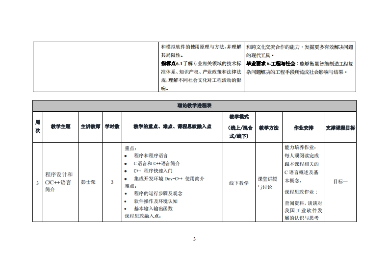 《(C语言程序设计》教学大纲课密名称:C语言程序设计课和类别(必修选修),必修课程英文名称:C Language Programming总学时/周学时学分,48/3/3其中实险实减学时,24先修课是:大学生计算机基础概论后续裸程支撑:单片机应用与开发授课时间:第3-18周,周二9-11节、周四9-11节授裸地点:实验楼605机房提课对律:2024智能制造1、2班开课学跳:粤台产业科技学院任课妆加姓名职称:彭士荣/副教授答疑时何、地点与方式:1分配习愿演练,采用集中讲解方式课程考核方式:开卷()闭卷(√)课程论文()其它(√)使用触材:从问愿到程序:CC+程序设计基础C程序设计(第五版)敏学事考度料:L.C语言程序设计:现代方法第2版修订阁,美]KN.Kig,人民郎电出版社2.线上:C语言教程https://www.runoob.com/cprogramming/c-tutorial..html课程简介:培养C语言基本铺程能力,并且具名环填开发乘统及执行能力。C语言主要目的为开发N八作业系统以普代部分使用组合语言所精写的工作,收常应用至单片机开发及编程,其核心能力包括建义问愿、问愿分析、设计清算法及精可程序能力。课程妆学目标及对毕业要求标点的支撑:课程妆学目标支排中业买求指标点单业要求