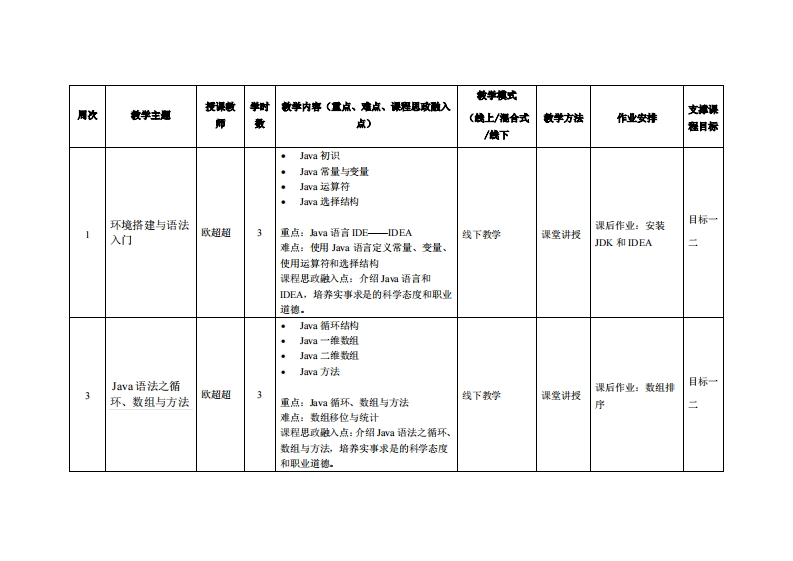 《Java语言基础》教学大纲裸程名称:Java话言基础课和类别(必修选修)多必修课程英文名称:Fundamentals of Java language总学时周学时学分,48G/3其中实检实减学时,24先修塞:无后续课程支嫌授课时间:授课地点:提课对津:2021毁电商开裸学洗:粤合产业科妆学陕任课枝师姓名淋:歌怎/无答鞭时间、地点与方式:1每次课的课前、课间和课后,采用一对一的问答方式:2每次实线课,采用集中讲解方式课狸考核方式:开卷()闭卷(√)课程论文()其它()使用教材,Java话青程序慢计(第3版),海有,张李薄,清华大学出版社1SBN97873025819妆学考资料:1.Java核心技术卷I,美凯S看渐特漫Cay S Hor着,周立新保机城工业出版社1BN:978711154726线上:事课网(https::w.imooc.com)1.Java https://class.imooc.com/sale/java20212.hava入门(DEA工具)btps:/ww.imooc..com/eam/8s课程情介:本课程介绍Jav语言基础,应用Jaa语言解决实际问题。包括Jva语言概述,Jaa语言基础,标识符、关键字和数据类型,运算符、表达式和语句,类、对象和接口,数组与字符串,时间、日期和数字