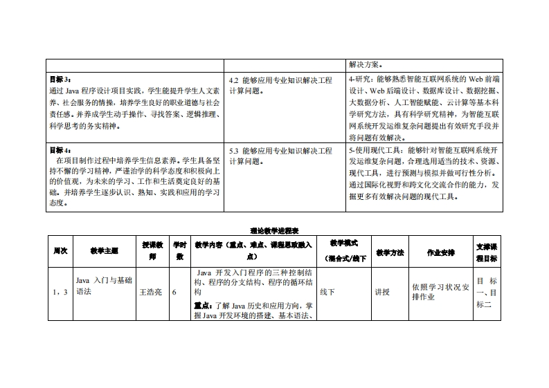《Java语言基础》教学大纲课避名称,Java语言基础课和类别(必修选修)·必修课程英文名称:Java Language Fundamental总学时周学时学分,483/3其中实枪实液学时,24先修课是:程序设计1后续课程支排Java语言应用开发授课时间:1-16周星期二6-8节授课地点:机房503课对律:2023级跨境电商1班2班开裸学洗粤台产业科技学院任课就师姓名淋:王浩亮/刷教授答聚时间、地点与方式:课堂或课后,教室或通讯软件,当面或线上答疑裸被方式开卷()闭卷()课程论文()其它(√)非试卷类报告使用被村:马宏茹,范祥林,李春平.Java基础项目战M北京:哈尔滨工程大学出版社,2023年3月.款学考资料:(1)耿样义,张跃平Jva2实用教程(第6版)M北京:清华大学出版社2021年7月.(2)黑马程序员Java基础入门(第3版)[M,清华大学出版社,2022年1月课是摘介:本课程是跨境电商专业的学科基础必修课,课程借助于J语言来讲授面向对象程序特性,建立面向对象的编程思维框架,研究如何从对象的角度出发构建程序单元以及序开发机制。课程内容包括类、对象、数据抽象、封装、继承、多态等面向对象基础内容,同时讲解J的高级特性。旨在培养学生使用aV语言进行程序设计的基本能力,掌握较扎实的aa语法基础,理解面向对象程序设计的思想,并且养成良好的编程习惯和规范的编程