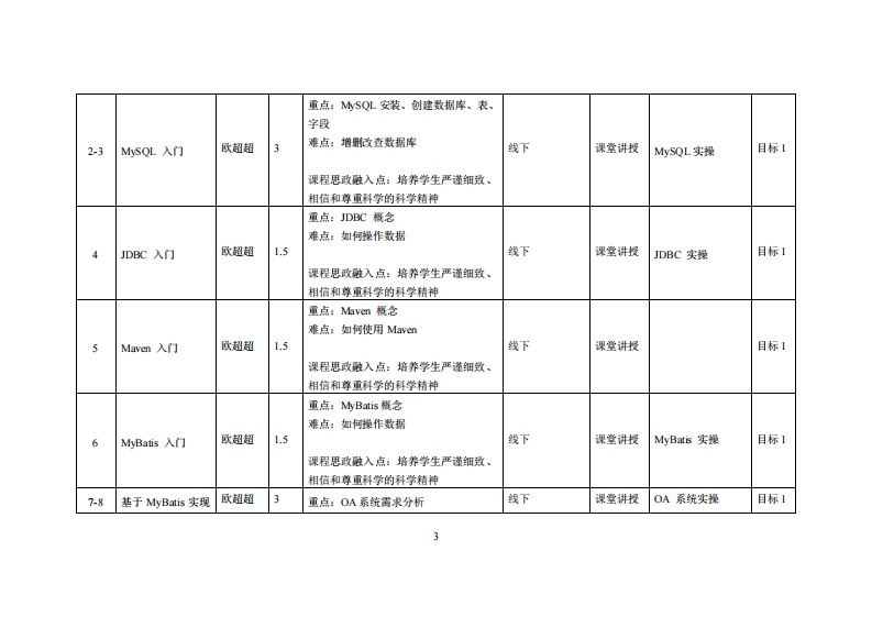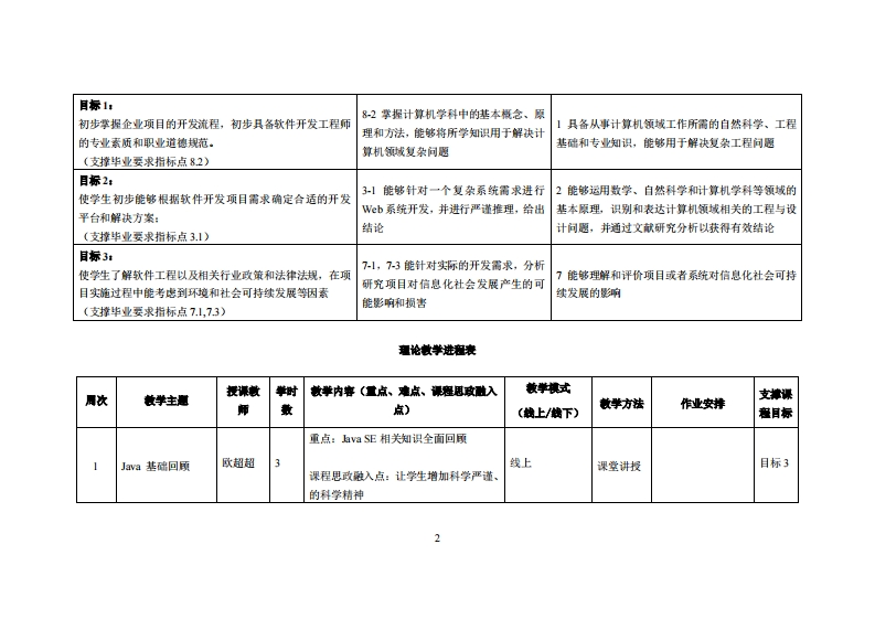 《Java语言应用开发》教学大纲课名称,Jaa语言应用开发课和类别(必修选修):必修课程英文名称:Java language application development总学时周学时学分,48w3/3其中实检实液学时,24先修课是:Java语言基赠后续课程支燥授课时间:2-4节(1-16周)授课地点:机房606课对津:21计技电商1雍开裸学洗:粤台产业科技学院任课放甲姓名林:欧超超/硕士答展时间、地点与方式:工作日时何/图书培316课狸考楼方式:开卷()闭卷()课程论文(√)其它()使用微材轻量级Java Web企业应用实战一Spring MVC+Spring+MyBatis整合开发妆学事考资料:课程物介:本裸包含面向对◆程序设计的基础知识,如何辅写Java应用程序Application:Java的常用标准类岸、轴程技巧、M小ySQL表据岸、JDBC、MaenfyBatis、Spring Boot等内客,课程放学目标及对毕业要求指标点的支排:温过本课程的学习,帮助学生掌漫面向对康的神程设计思想,并能运用J故术和基本开发工人进行计算机款件设计,培养学生用面向对◆程序设计思想和浸舞思维方式进行计算机偏程,自发学生的创新意识,提高学生在款件设计过程中分析何息和解决问惠的实示动手能力,使学生的理论知识和实陵技能得到供同提高。课老妆学耳标支撑毕业要求湘标点单业要求