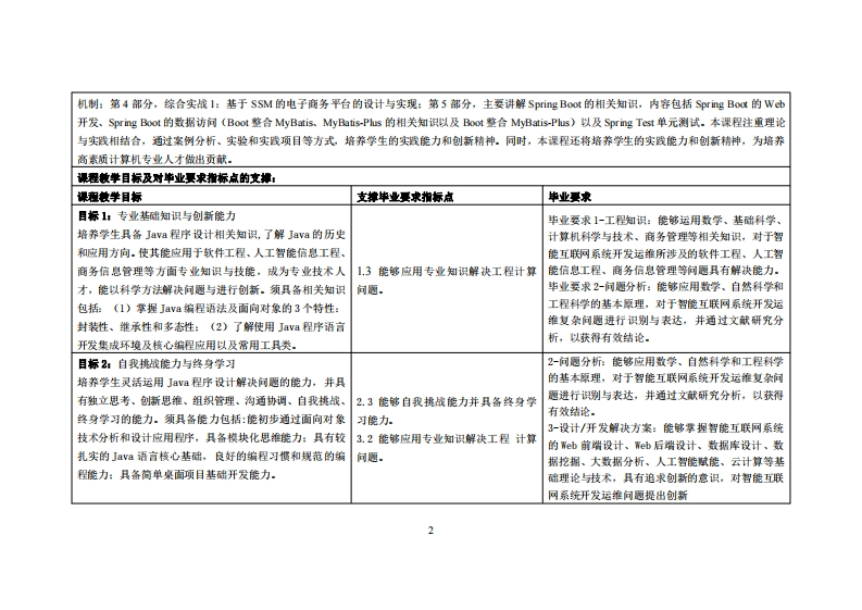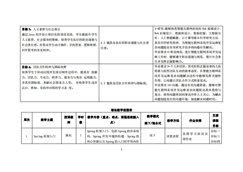 《Java语言应用开发》教学大纲裸程名称:Java话言应用开发课程类别(必修选修)事必修课程英文名称:Java Language Application Development总学时/周学时/学分,4833其中实险实戒学时:24先能课是:Java语言基础后续课程支撑:移助应用开发授课时间:里期三341-16周曼期五1-2节(9-16周授课地点:实验接503提课对津:24电商1班26人,24电商2班27人开课学洗:粤台产业科技学陕任课收甲姓名职淋:陈权测故提容振时间、地点与方式:课堂或裸后,教直或通讯软件,当面成线上答鞭课程考核方式:开卷()闭卷()课程论文()其它()非试卷类报告使用微村:陈旭.Spring+Spring MVC+MyBatis+Spring Boot框架整合开发,清华大学出版社,2024年8月.,ISBW:9787302859549收学◆考资料:陈恒.SSW+Spring Boot+Vue.js3全栈开发从入门到实战.北京:清华大学出版社,2022.陈恒、楼偶俊,Spring Boot从入门到实战,清华大学出版社,2020年6月.,ISW:9787302551881课程简介:本课程是跨境电商专业的学科必修课,课程将系统地讲授Spring、Spring MVC、MyBatis、Spring Boot等框架的基础知识和实际应用.具体内容包括S部分:第I部分,主要讲解Spring框架的相关知识,内容包括Spring loC、Spring Bean、.Spring AOP以及Spring的事务管理:第2部分,主要讲解Spring MVC的相关知识,内容包括Controller、.数据绵定和表单标签库、拦截器、数据验证、国际化、统一异常处理以及文件的上传和下载:第3部分,主要讲解MyBatis的相关知识,内容包括SSM框架整合开发的基本思想、肤射器、传参与查询结果集存储、级联查询、动态SQL以及MyBatis的缓存
