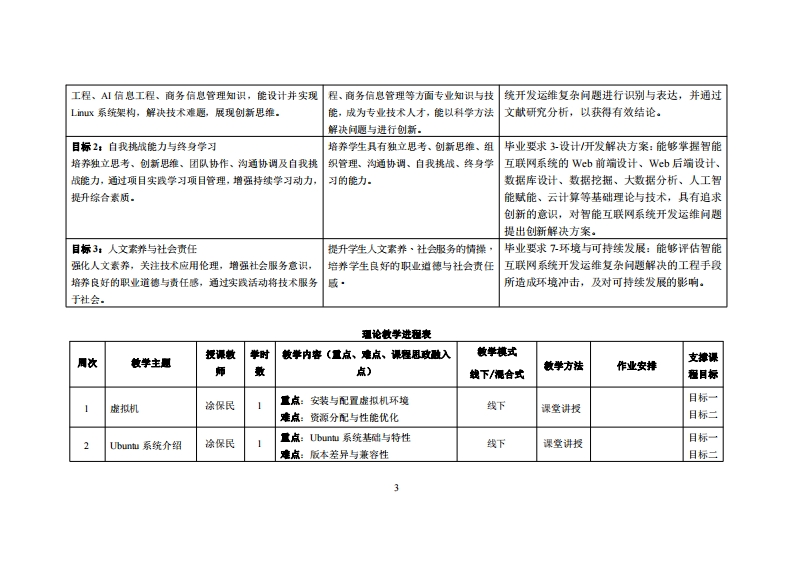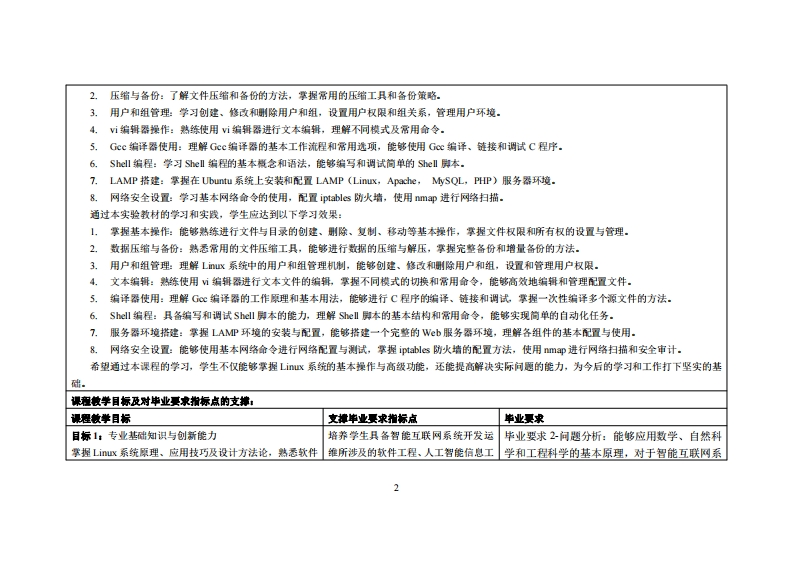(Linux系统应用与设计》教学大纲裸容名称:L血匹莱统应用与设计课程类别(必修选修)事选修课程英文名称:Application and Design of Linux System总学时周学时/学分,32/2/2其中实险实戒学时:16先维课是:数据结构、计算机组成与系统结构、操作系统后续课程支撑:专思制作1、专思制作2、毕业设计授课时间:2-17周量期三1,2节授课地点:实验接503投课对津:2023鞭电商12班开课学洗:粤台产业科技学陕任课师姓名只淋:涂保民副微战容振时间、地点与方式:课堂或裸后,教直或通讯软件,当面成线上答鞭课程考核方式:开卷()闭卷()课程论文()其它()期末报告使用敏材:《Ubunt山Linx操作系统与实验教程(第二版)》,马丽将等,清华大学出版社,2020年8月,ISBN:987302555414收学◆考资料:无课程简介:《Lix系统应用与设计》课程台在帮助学生罩握Lix系统中的基本操作与高级功能,涵盖广泛的主题,包括文件与目录管理、压缩与备份、用户和组管理、Vi编辑器操作、Gcc编译器使用、Se编程、LAMP环境搭建、网络安全设置等。通过系统的实验练习,学生将能够熟练使用Liux系统,理解其底层机制,并具备解决实际问愿的能力。本教材重点介绍了以下几个关键方面:L.文件与目录管理:掌握L系统中基本的文件和目录操作,理解文件权限和所有权的配置与管理。