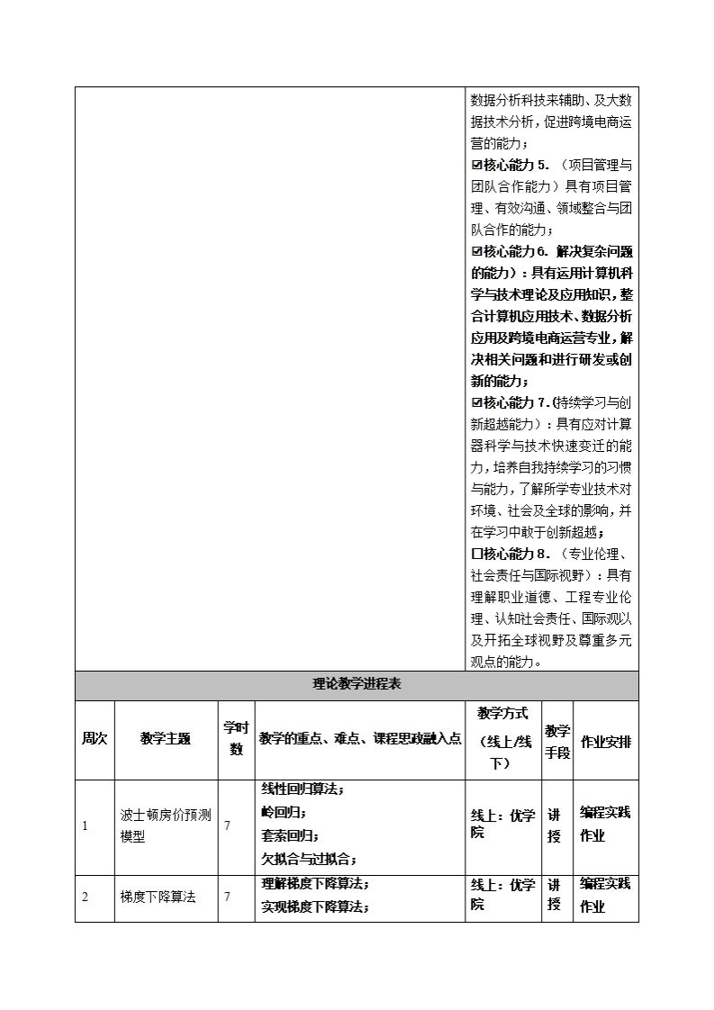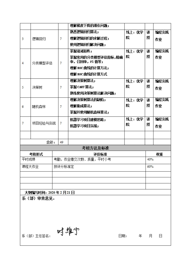 《Linux系统应用与设计》教学大纲课程名称:Li血ur系统应用与设计课程类别(必修选修):选修课程英文名称:Li血ux System总学时调学时学分:4973其中实验实践学时:21先侈课程:数据库、程序设计、Python与大数据分折授课时间:9至15周,周五1-7节授课地点:机电楼303机房授课对像:2018级计算机科学与技术系跨境电商1班开课学院:皂台产业科技学院任课教师姓名职称:郭嗾答疑时间、地点与方式:课前、课间和课后;教室;路、交茨。课程考核方式:开卷()闭卷()课程论文(√)其它()使散材:教学多考资料:《机器学习实战》,奥雷利按杰龙,机械工业出版社。课程简介:本课程系统旨在培养新时代机器学习与人工智能人才,经本门课程学习以后,学姓可臭熟练使用机器学习相联算法解决实际问题。涉及线性回归,逻辑回归,决策树,随机森林等相联算法,可自主建模解决问题。课程教学日标本课程与学生核心能力培养一、知识目标:之间的联联授课对像为理工1.掌握凯器学习算法建模的思想;科专业学生的课程填写此拦):2.熟悉涉及线性回归,逻辑回归,决策树,随机森林等相联机器☑核心能动1.(交叉知识的学习算法。运用能动):具有运用数学、二、能动目标:基础科学及计算机科学与技1.学会使用常用机器学习算法解决实际问爱;术相联知识的能动;2.熟练掌握数据与算法建模的思想。☑核心能动2.实验与数据解三、素质目标:读能动):具有计算机软件开1.培养学生具有主动修与、积极进取、崇尚科学、探究科学的学发与数据搜寻分析解释的能习态度和思想意识;力2.养成理论联系实际、科学严谨、认直细政、实事求是的科学态☑核心能动3.(技术工具的度和吧业道德。应用能力)具有计算器软件工程技术应用、数据搜集分析应用跨境电商运营知识与技能、及大数据技术的专业所需的技术、技能和使用软硬件辅助工具的能力;☑核心能力4.(计科与大数据分析专业能力):具有编程设计能力并能应用计算器与