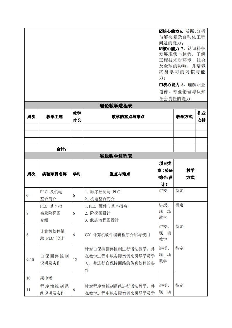 《PLC原理与实务》课程教学大纲课程名称:PLC原理与实务课程类别(必修/选修):选修课程英文名称:Principle and Practice of PLC总学时周学时/学分:54/33其中实验/实践学时:54先修课程:电工电子、数控技术、C语言编程授课时间:6至14周,周六1-4节,5-6节授课地点:机电楼401授课对象:2017自动化1班开课学院:粤台产业科技学院任课教师姓名职称:陈尚彦副教授答疑时间、地点与方式:上课前后在上课教室答凝,其他时间在机电楼401答疑。还可利用网络课程平台随时留言答乘。课程考核方式:开卷()闭卷()课程论文()其它(√)使用教材:《电气控制与PLC及应用(三菱X系列)》,刘祖其,刘海,康挂花,电子工业出版社,2016。教学参考资料:《三菱系列PLC入门与应用实例》,洪应编,中国电力出版社,2010,第1版课程简介:机床电气与PLC技术是机械工程专业的专业选修课。本课程以PLC控制器作为机电整合所需之主要工具,透过棋块实习,使学生能将机械与电机、电子相互结合,以增进学生具备机电整合实务技术之能力。课程教学目标本课程与学生核心能力培1.知识与技能目标:通过本课程的学习,使学生掌握三菱FX2N系养之间的关联(授课对象列PLC的组成、原理、指令和编程方法;理解PLC的基本概念和基本为理工科专业学生的课程原理;了解PLC控制系统的设计和维护方法:具有较熟练的电气自动化填写此栏):控制的综合应用能力。☑核心能力1.掌握从事2.过程与方法目标:在学习PLC的基本概念和基本原理、指令和自动化领域所需数学和基础科学知识:编程方法等内容的过程中,使学生的思维和分析方法得到一定的训练,☑核心能力2.对自动化在此基础上进行归纳和总结,逐步形成科学的学习观和方法论。系统或产品的技术进行3.情感、态度与价值观发展目标:通过本课程的学习,培养作为一分析、解释相关数据及个机械工程技术人员必须具备的坚持不解的学习精神,严谨治学的科学独立设计的能力:态度和积极向上的价值观,为未来的学习、工作和生活莫定良好的基础。☑核心能力3.掌握自动化专业中“信息、控制和系统”的基本原理及应用方法,了解自动化领域的前沿和发展动态:口核心能力4.具有创新意识和自动化新产品、新设备进行开发和设计的能力:口核心能力5.项目管理、有效沟通协调、团队合作及创新能力: