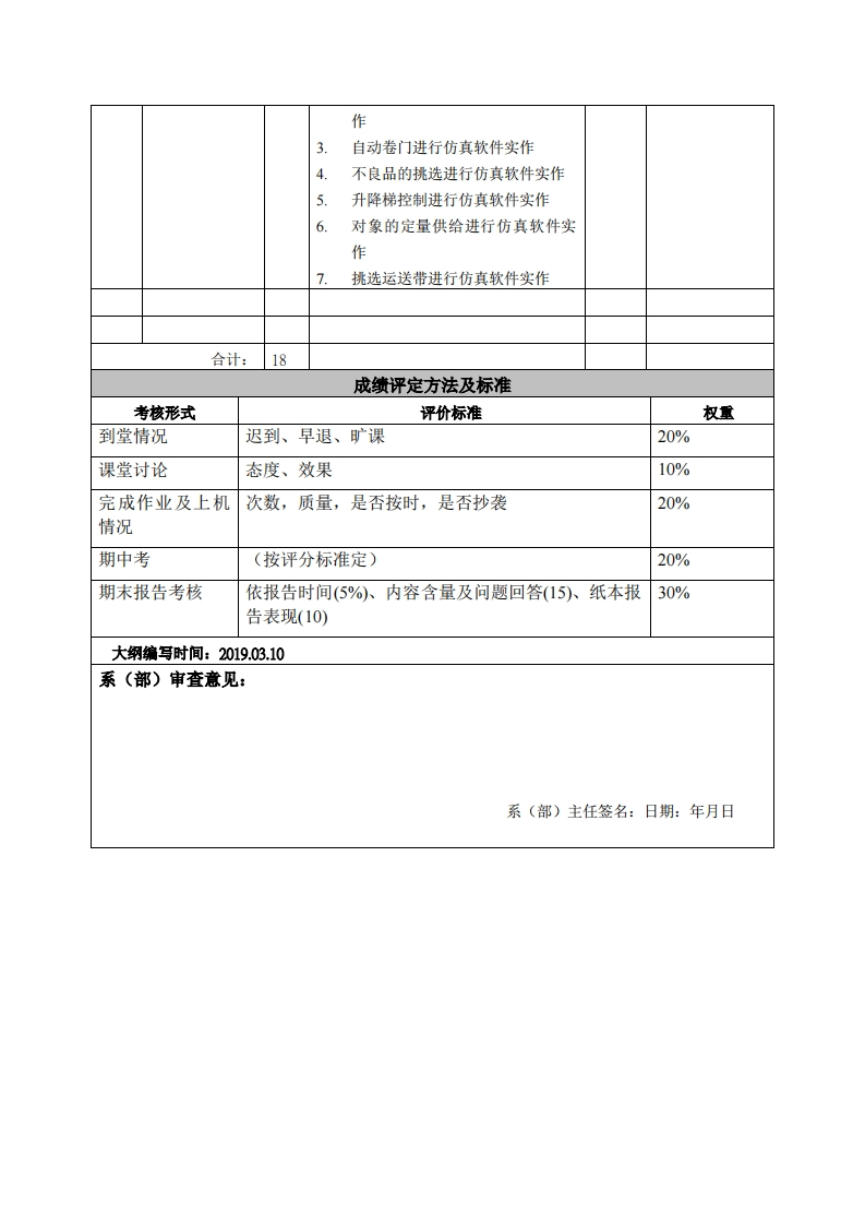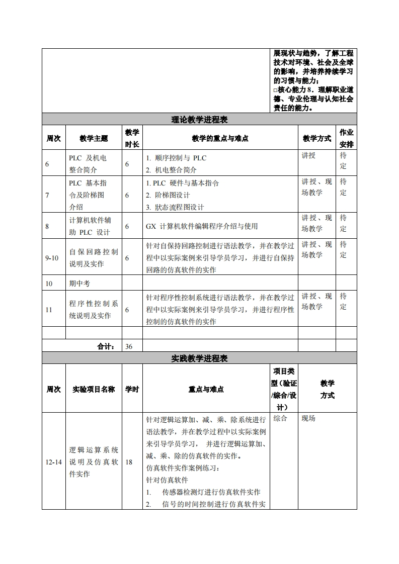 《PLC原理与实务》课程教学大纲课程名称:PLC原理与实务课程类别(必修选修):选修课程英文名称:PLC Technology总学时/周学时/学分:543/3其中实验/实践学时:18先修课程:电工电子、数控技术、C语言编程授课时间:6至14周,周三5-8节,910节授课地点:机电楼401授课对象:2017精密制造1班开课学院:粤台产业科技学院任课教师姓名职称:陈尚彦副教授答疑时间、地点与方式:上课前后在上课教室答凝,其他时间在机电楼401答疑。还可利用网络课程平台随时留言答乘。课程考核方式:开卷()闭卷()课程论文()其它(√)使用教材:《电气控制与PLC及应用(三菱X系列)》,刘祖其,刘海,康挂花,电子工业出版社,2016。教学参考资料:《三菱系列PLC入门与应用实例》,洪应编,中国电力出版社,2010,第1版课程简介:机床电气与PLC技术是机械工程专业的专业选修课。本课程以PLC控制器作为机电整合所需之主要工具,透过棋块实习,使学生能将机械与电机、电子相互结合,以增进学生具备机电整合实务技术之能力。课程教学目标本课程与学生核心能力培养之间的关联(授课对象1.知识与技能目标:通过本课程的学习,使学生掌握三菱FX2N系为理工科专业学生的课程列PLC的组成、原理、指令和编程方法;理解PLC的基本概念和基本填写此栏):原理;了解PLC控制系统的设计和维护方法:具有较熟练的电气自动化☑核心能力1.应用数学、控制的综合应用能力。基础科学和机械设计制造及其自动化专业知识能2.过程与方法目标:在学习PLC的基本概念和基本原理、指令和力:编程方法等内容的过程中,使学生的思维和分析方法得到一定的训练,☑核心能力2.设计与执在此基础上进行归纳和总结,逐步形成科学的学习观和方法论。行机械设计制造及其自动化专业相关实验,以及分3.情感、态度与价值观发展目标:通过本课程的学习,培养作为一析与解释相关数据的能个机械工程技术人员必须具备的坚持不懈的学习精神,严谨治学的科学力:态度和积极向上的价值观,为未来的学习、工作和生活莫定良好的基础。☑核心能力3.机械工程领域所需技能、技术以及实用软硬件工具的能力:口核心能力4.机械工程系统、零部件或工艺流程的设计能力:口核心能力5.项目管理、有效沟通协调、团队合作及创新能力:☑核心能力6.发掘、分析与解决复杂机械工程问题的能力;☑核心能力7.认识科技发