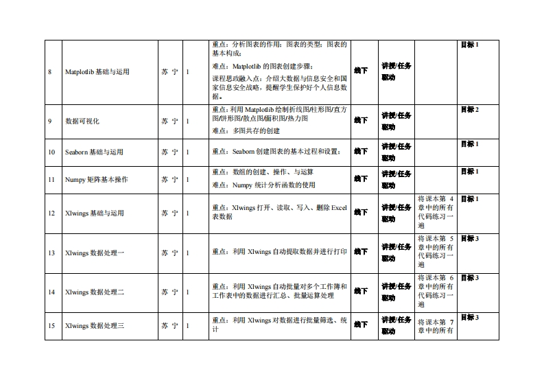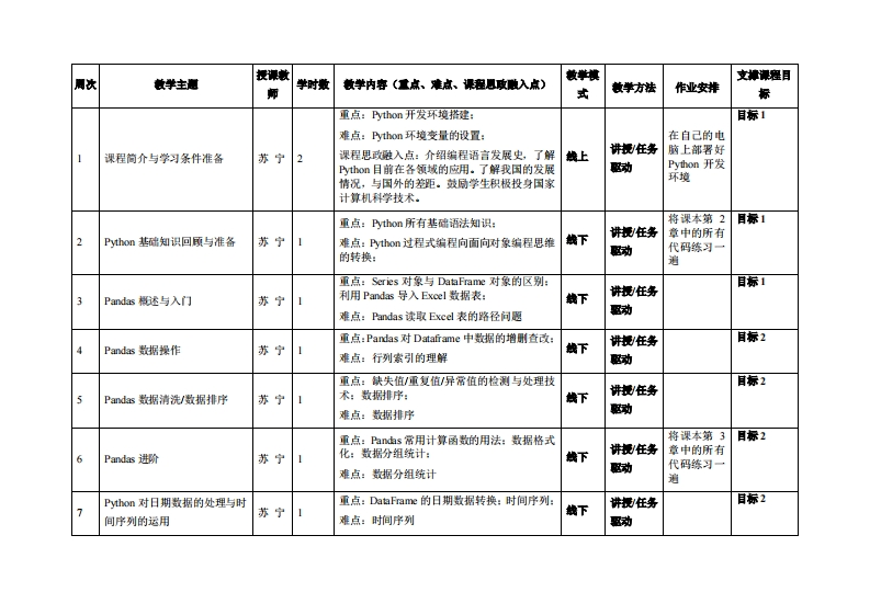 《大数据分析一)》教学大纲课程名称:Ph0n大数据分折一)谦类别(必修进修):专业进修课课程英文名称:Python and Big Data Analysisl总学时周学时学分,32/22其中实险实成学时,16先他课程:程序设计1,程序设计Ⅱ数课时间:1至16周,周一34节拉课地点:莞城校区机电接303提课对◆:2021级经济与金敢(管理)2斑开课学洗粤合产业科技学洗任裸嫩师姓名职称:苏宁工程师容时间、地点与方式:116周,周一12节,撒信群机电接303漂避特核方式:开卷()闭卷()课程论文()其它()使用就材:《Pyho叶Excd职场办公兼据分析》教学考资料:《金数大数调分析第2版》课密物介:《大数海分折(一)】课在是大数据技术专业选维课,本课避一门以计算机应用结合金微共戒的课理。通过本课短,能速金微大数据摆老,丁解金激大数据的实标应用场景,靠利用P山阳话言对大数据的处道。本课和的先修课为《程序设计》,要求学生掌强Pyb0情把基。课程数学目标及对单业要求指标点的支排年2、B4、2、D1课程敏学目标支排单业要求州标点单业要球目标1,了解在获取经济金融数据实践中所具有较强的学习新知识、新技术、新工具与自能部署Python开发环境,编写Python程序.需的最新工具。我提升能力:目标2:能使用新工具分析经济金融数据具有较强的信息检索、分析、处理能力:能使用Python常用数据分析模块进行数据处理和分析具有良好的综合应用知识能力和实践能力,能目标3:培养学生跨专业跨学科的学习能力能够利用计算机应用能力配合本专业的发展把学到的经济学和金融学知识运用于实践。理论就学进程表