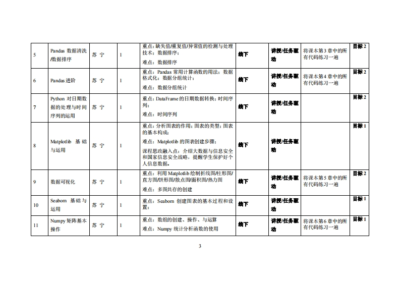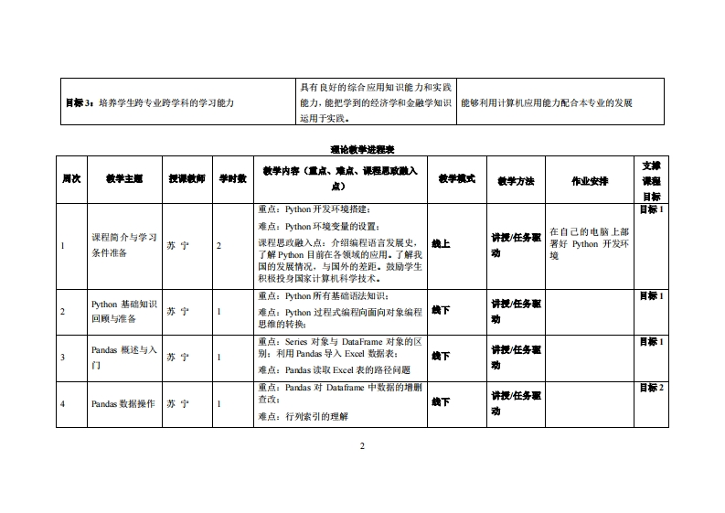 《Python与大数据分析》教学大纲裸避名称,Pyon与大数据分析课和类别(必修选修)事选修课程英文名称:Python and Big Data Analysis总学时周学时学分,322/2其中实检实液学时,16先继课是:程序设计1、程序设计山后续课程支排金融科技产品分析与应用、机墨学习、m格爬虫实务授课时间:1-16周星期四3-4节授课地点:实503机房课对律:22敢1班(科技)、22金敢2班(管理)开裸学陕:粤台产业科技学院任课数姓名职淋:苏宁工程师答展时间、地点与方式:课后、实整楼205、面答徽信群课程考核方式:开卷()闭卷()课程论文()其它(实报告)使用微材,《Pyt0n数据分析从入门到实液》、《Py山om金数实战来例精带第2版》课庭情介:《0大数湘分折》课程是大戴洲放术专业进恤课,本谋容是一门以计算机应用结合金融实液的课准。道过本课程能速解鱼大数漏餐志,了解金大敏海的实际应用场录,掌利用Py山0如语言对大教端的处理。本课容的先修课为《程序设计》,要求学生靠量Py山0加辅基础。课程数学目标及对毕业要求指标点的支排:2、B4、C2、D1课被学目标支撑单业要买求指标点华业要求目标1:了解在获取经济金融数据实践中所需的最新工具有较强的学习新知识、新技术、新工具。能部署Python开发环境,编写Python程序.具与自我提升能力:能使用Python常用数据分析模块进行数据处理和目标2:能使用新工具分析经济金融数据具有较强的信息检索、分析、处理能力:分析