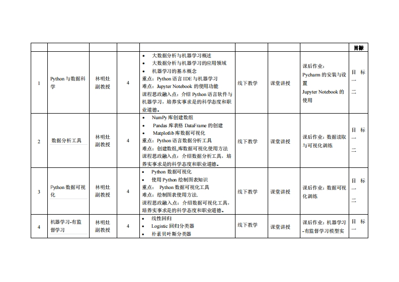 《Python与大数据分析》教学大纲裸寇名称,Pyt山on与大数据分析课和类别(必修选修)事必棒课程英文名称:Python and Big Data Analysis总学时周学时学分,48w3/3其中实检实液学时,24先修课是:振率与款速统计后续课程支撑云计算与大数据应用开没授课时间:1至16周期三12节:1-8两基期五34节授裸地点:实验楼机房503课对津:2023鞭计算机科学与技术時携电商)电商12薤博台开裸学陕:粤合产业荆妆学陕任课总柳姓名淋:林明灶/副数战答展时间、地点与方式:1每次课前和课后,实验楼307,采用一对一的问答方式:2每次习题课,采用集中讲解方式。课狸考核方式:开卷()闭卷()课程论文()其它(√)使用藏村:《Pyon大数据分析与机器学习商业案例实战》,王宇韬钱妍竹,机械工业出版社,ISBN987111654711.枚学◆考责料:《Pyn数据分析与实践》,柳教、毛峰、刘铁桥,清华大学出版社,ISBN9787302626121.课程物介:本课程介绍Pyhm语言软件基础,应用Pyhm语言解决实际问愿。包括数据结构与基本运算、高级数据管理、随机数与抽样模拟。从大数据中获取有用信息应用包括:机器学习在商业中的应用实战,详细金融数据风控、股票量化交易、商品智能推荐、用户情感分析等大数据分析技术课程放学目标及对华业要求指标点的文排:课妆学目标支撑毕业要求指标点单业要求