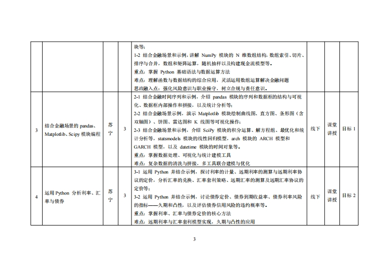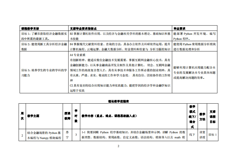 《Python与大数据分析)教学大纲裸程名称:Python与大数据分析课程类别(必修选修),专业必修课课程英文名称:Python and Big Data analysis总学时周学时/学分,48/33其中实险实我学时:24先熊课是:程序设计川后续课程支撑:量化金败交易缣略分析授课时间:2-17周周四24节:24金融1班:2-17周周五24授课地点:机电楼303节24金融2班提课对津:2024经济与金融1、2班开裸学院:粤台产业科技学院任课效即姓名职淋:苏宁/工程师管时间、地点与方式:2-17周周四1节:24金融1班,机电楼303:27周周三1节:24金啦2班,实验楼6楼机房:线下。课是考核方式:开卷(√)闭卷()课程论文()其它()使用敏材:《盖于Py山0n的金融分析与风险管理(第2版)》妆学梦考资料:《P山0经济金败敏据分析与决策】课程简介:大数烟时代,数想成为决策最为量要的套考之一,数据分析行业迈入了一个全新的阶段,通过举习本课程,使得举生能够掌提Ph科半计算、表据处理、敦据可祝化、艺视建模等基本技能,能够针对基本的数细挖知问愿与样例表据,调用Py山0n中的第三方扩晨包Nupy、Pads、apl加tb、S-eam及关联规则算法代码,进行处理、计算与分析,从而为其他的专业领城课程或者复来应用间愿提供基支撞,另外通过苹习本课程。使得学生在掌复Py山科学计算、数烟处理、数帽可权化、艺烟建横等基本技能基确上,进一步地扩晨应用到较为复杂金融数据处理及艺摄分析任务上,最后进行量化投资实战检验。本裸程为P山在金融数拥的具体应用,也是Py山在金融行业应用最为广泛的领域之一,从面使得学生具各一定的行业应用背景及蚊业技能。课是妆学目标及对毕业要求指标点的支排