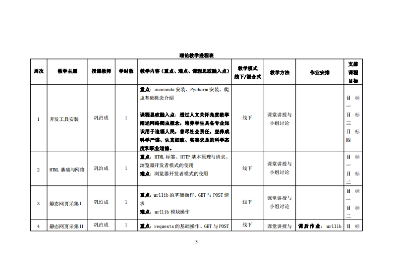 《Python网络爬虫实务》教学大纲裸程名称:Python网络和虫实务课程类别(必修选修)事选修课程英文名称:Python Web Crawler Practice总学时/周学时/学分,32/2/2其中实险实我学时:16先能课是:Python与大数拥分析,Wb前情应用开发后块课程支撑:新媒体普钠,深度学习授课时间:2-17周周一9,10节授课地点:实验接503投课对津:2023鞭电商开课学洗:粤台产业科技学陕任课师姓名只称:巩拍成助做容振时间、地点与方式:课堂或裸后,教直或通讯软件,当面或线上答鞭课程考核方式:开卷()闭卷()课程论文()其它()报告使用敏材:《Python爬虫超详细实战攻略:微课视频版》,夏牧捷等,清华大学出版社,2021年1月,ISBW:9787302538752妆学◆考资料:无课程简介:爬虫程序是数据技术收集信息的基础,爬取到需要的数据后,就可以对数据进行分析和建立应用。网络爬虫就是自动的从互联网上获取数据的程序.基本上我们在浏览网站时所能见到的数据都可以通过爬虫程序保存下来,可以透过爬虫程序来获取相关的数据。本课程主要分成四大部分,第一部分为网络爬虫相关基础知识,包括html,浏览器开发者工具、http请求的介绍。第二部分为数据请求方法介绍,包含wrllib和requests的使用操作。第三部分为数据提取方法,包括正则化、Xpath及beautifulsoup4等三种提取数据的方法.第四部分为进阶爬虫技术及综合实毁,包括js逆向分析、selenium工具、scrapy框架及实际爬虫演练