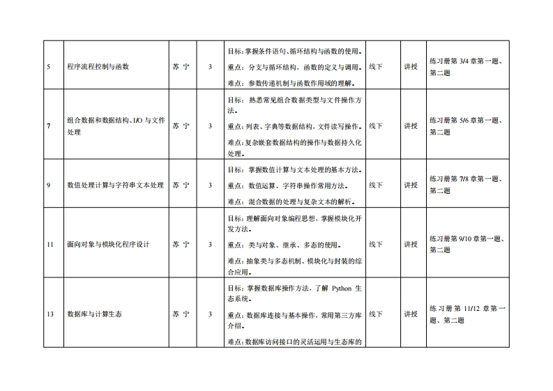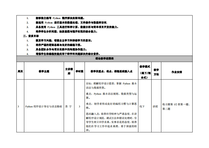 《Python语言程序设计》教学大纲潭程名称:Pyh0n语言程序设计课程类别(必棒选修):必修课程英文名蒋:Python Pro吧ramming总学时/周学时学分:48/30其中实险实腹学时:24先修课程:无授课时间:3-18周,周四911节:25级金融1班:周日9-11节:25级金融2班授课地点:凯电楼303授课对橡:25级经济与查融1班2班开课学院:粤台产业科技学院任课教师姓名职麻:苏宁/工程师答领时间、地点与方式:318周:周四12节:25级金融1班:周日12节:25敏金融2班:机电楼303:线下。漂程考核方式:开卷()闭卷()课程论文()其它(√)使用就材:《Py山0n辅程从入门到实战》数学参考资料:无课程简介:Py山0语言是一种解舞型、面向对象的计算凯程序设计语言,广泛用于计算凯程序设计敏学语言、科学计算、数据分析、网培飞虫、人工智能、机器学习、大数据等,特别适用于快速开发应用程序。Py山语青深要开发者的喜受已经戒为最受欢迎的程序设计语言之一。本课程介绍了Py山0语言的蔷础知识以及使用Py山0语吉开发的应用实例。具体内容包括程序设计导论、Py山o话言盖随、程序流程拉制、函散和代码复用、组合数据和敢据结构盖础、输入输出和文件处理、败值和日期处理、李符事和文本处理、面向对律的程序设计、模块化程序设计、数据库访问以及Python计算生泰Python第三方库等.课程敏苹目标:一、知识目标1.理解Py山0n语言的盖本特征、发晨背景与应用领以。2.掌握Py山程序的著本活法规则、数据类型、流程控制姑构。3.熟透函散、棋块化、面向对律情程等核心根老。4.了解Py山常用算三方库在科学计算、数据处理与人工智能中的典型应用。二、能力目标