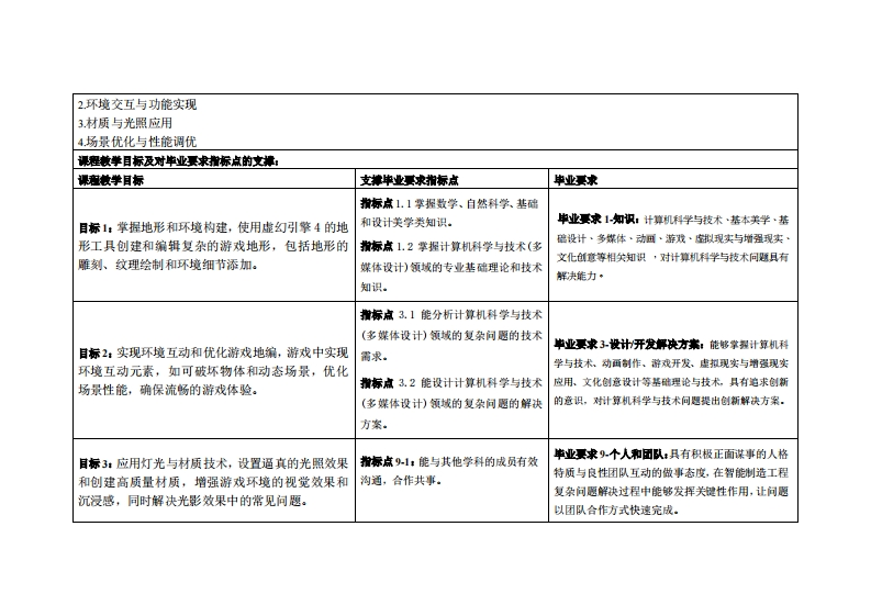 《UE4基础应用》教学大纲裸斑名称,UE4基础应用课和类别(必修选修)·选修课程英文名称:UE4 Fundamentals总学时周学时学分,3222其中实脸实液学时,160先继课是:数字图像处理与数字绘图,数字建模,场景建模设计后续课震支撑作品集设计·多媒体项目实作授课时间:2至17周星期二3-4节授裸地点:实114机房提课对律:2022多媒体1班开裸学陕:粤台产业科技学院任课就师姓名淋:吴金添答展时间、地点与方式:1每次课的课前、课间和课后,采用一对一的问答方式:2每次习题课,采用集中讲解方式。课狸考核方式:开卷()闭港()课程论文()其它(√)非试港类报告使用微材:《虚拟现实与增强现实技术概论》,类岩,清华大学出版社。,ISBN:9787302444800课难信介:本课程旨在为初学者提供虚幻引整4(E4)的基础知识和技能。内容涵盖E4的用户界面与基本操作、场景创建与编辑、蓝图可视化脚本编程、材质与光照设置,以及简单的游戏逻辑实现。通过理论讲解和实际操作,学生将学习如何在E4中构建和优化游戏场景、创建互动内容,并了解游戏开发的基本流程。本课程适合有兴趣的初学者,帮助他们掌握虚幻引擎4的核心功能,为进一步学习和开发打下坚实基础。其中内容包括1地形与环境构建