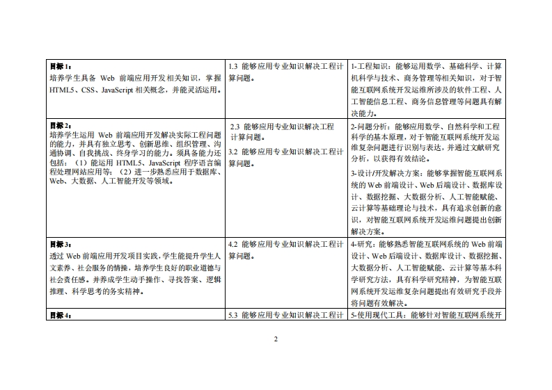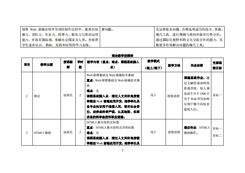 《Web前端应用开发》教学大纲课名称,Web前靖应用开发课和类别(必修选修):必修课程英文名称:Web front-end development总学时周学时学分,48w3/3其中实险实戒学时,16先继课是:程序设计1后续课程支撑电子商务实务授课时间:522周13节授课地点:机房503课对津:2022纸時境电商1班、2班开裸学陕:粤合产业荆妆学陕任课总柳姓名淋:涂保刚越拉答振时间、地点与方式:课堂或裸后,放室或通讯状件,当面或线上答展课程考核方式:开卷()闭卷()课程论文()其它()使用微村:《HTML5网页前端设计(第2版)》,周文洁,清华大学出版社,2021年2月,1SBN:9787302553588妆学事考资料:《从0到1:HTML+CSS+JavaScript快速上手》,莫振杰,人民邮电出版社,2019年12月,ISBN:9787115519740课程物介前端技术一般分为前端设计和前端开发,前端设计一般可以理解为网站的视觉设计,前端开发则是网站的前台代码实现,包括基本的HTML和CSS以及JawS©pt等。这三个是前端开发中最基本也是最必须的三个技能。前端的开发中,在页面的布局时,HTML将元素进行定义,CSS对展示的元素进行定位,再通过JavaScript实现相应的效果和交互。本课程教导学生在进行开发前,对这些概念弄清楚、弄明白,在开发的过程中才会得心应手。课程放学目标及对华业要求指标点的文排:课程妆学目标支撑毕业要求指标点单业要求