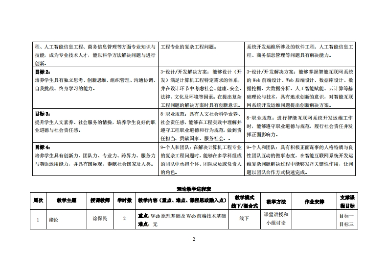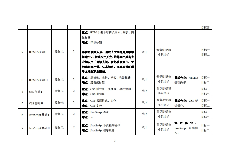 《Web前端应用开发》教学大纲课名称,Web前靖应用开发课和类别(必修/选修):必修课程英文名称:Veb front--end development总学时周学时学分,48w3/3其中实检/实减学时,16先修课塞:无后续课程支撑电子商务实务、Py山0加网格爬虫实务授课时间:1,5-19周星期一5-7节授裸地点:实503机房课对津:2023纸時境电商1班、2班开裸学洗:粤合产业科妆学陕任课柳姓名淋:涂保民测做战答振时间、地点与方式:课堂或裸后,放室或通讯状件,当面或线上答展课程考核方式:开卷()闭卷()课程论文()其它()报告使用微村,《HTML5网页前端设计(第2版)》,周文洁,清华大学出版社,2021年2月,ISBN:9787302553588妆学事考责料:无课程物介:前端技术一般分为前端设计和前端开发,前端设计一般可以理解为网站的视觉设计,前端开发则是网站的前台代码实现,包括基本的HTML和CSS以及JavaScript等。这三个是前端开发中最基本也是最必须的三个技能。前端的开发中,在页面的布局时,HTML将元素进行定义,CSS对展示的元素进行定位,再通过JavaScript实现相应的效果和交互。本课程教导学生在进行开发前,对这些概念弄清楚、弄明白,在开发的过程中才会得心应手。课程教学目标及对毕业要求指标点的支排:裸程妆学目标支撑单业要求指标点单业要球目标1:1-工程知识:能够将数学、自然科学、1-工程知识能够运用数学、基础科学、计算机科培养学生具备智能互联网系统开发运维所涉及的软件工工程基础和专业知识用于解决计算机学与技术、商务管理等相关知识,对于智能互联网