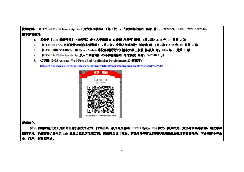 《Wεb前端应用开发》教学大纲课应名称,Web前墙应用开发课忍类别(必修选修)必修课是荚文名称:Web Front End Application Development总学时周学时学分,48W33其中实检实液学时,10先修课塞:计算机概论后续课程支推Database Application、WEB情惠处建授课时间:520周周一5-7节授裸地点:实验楼616机房提课对律:2023计技3班开裸学洗:粤台产业科技学院任课总师姓名淋:时惟宁刷教授答票时间、地点与方式:1每次课的课前、课间和课后,采用一对一的问答方式(实验楼215):2每次习题课,采用集中讲解方式狸拔方式:开卷()闭卷()课程论文()其它()