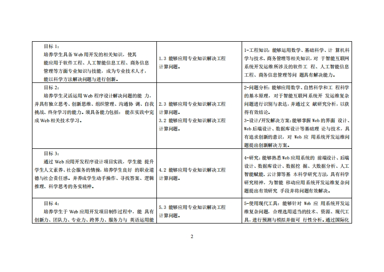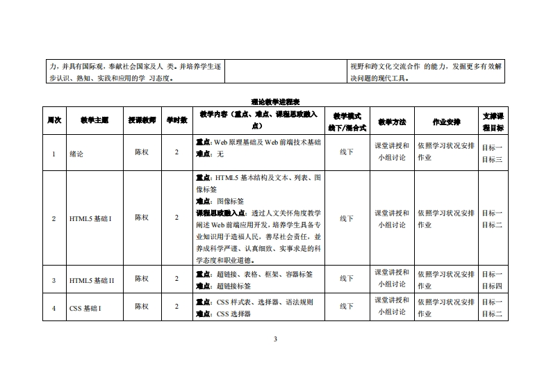 《Web前端应用开发》教学大纲课应名称,Web前墙应用开发课和类别(必修/选修):必修课程英文名称:Web frontend application development总学时周学时学分,48w3/3其中实险/实液学时,24先修课塞:无后续课程支撑电子商务实务、Py山0加网格爬虫实务授课时间:周二9-11节3-18周授裸地点:实验楼503机身课对津:2024电商1班2班开裸学陕:粤合产业科妆学陕任课柳姓名淋:陈权测做战答振时间、地点与方式:课堂或裸后,放室或通讯状件,当面或线上答展课程考核方式:开卷()闭卷()课程论文()其它()报告使用微村,《HTML5网页前端设计(第2版)》,周文洁,清华大学出版社,2021年2月,ISBN:9787302553588妆学事考责料:无课程物介:网页设计技术是建构商务网站项目策划、商务网站项目建设与管理之核心技术,网页设计一般分为前端设计和前端开发,前端设计一般可以理解为网站的视觉设计,前端开发则是网站的前台代码实现。本课程授内容包括基本的HTML和CSS以及JavaScript等,这三个是前端开发中最基本也是最必的三个技能。前端的开发中,在页面的布局时,HTML将元素进行定义,CSS对展示的元素进行定位,再通过JvS©pt实现相应的效果和交互.本课程教导学生在进行开发前,对这些概念弄清楚、弄明白,在开发的过程中才会得心应手。课程放学目标及对毕业要求指标点的文排:课应妆学目标支撑单业层求州标点单业要求