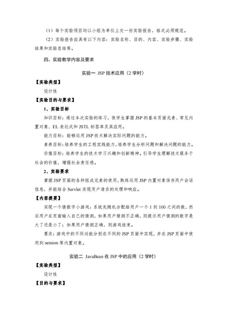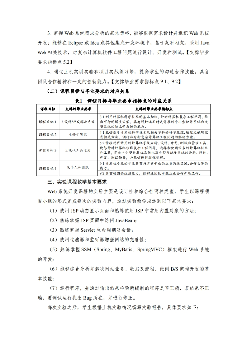 《Web系统开发》实验教学大纲一、实验课程基本信息课程名称:Web系统开发Web System Development课程代码:06E4126B课程性质:非独立设课课程类别:专业核心课程/必修课适用专业:计算机科学与技术专业实验学时:20学时开设实验项目数:6课程学分:3.5学分修读学期:第6学期二、实验课程目标《Wb系统开发》是计算机科学与技术专业的一门专业核心课,是有关网络程序设计的较高级内容。通过理论教学、上机实训实验、项目实战练习等教学环节,掌握Web系统开发的过程、工具与规范方法,为学生将来从事基本Wb的系统开发打下坚实的基础。(一)具体目标通过本课程的学习,使学生达到以下目标:1.理解Wb应用及开发的基本概念,熟悉Web应用程序的体系结构,掌握JSP、Servlet、.JavaBean等技术的语法和应用,掌握使用JDBC访问数据库,掌握MVC模式的工作原理,掌握Mybatis、Spring和SpringMVC三个框架的工作原理,能够应用Java Web技术和MVC模式或某框架,并结合实际问题,对复杂计算机软件工程中的关镀问题分析、设计出一套可行的解决方案。【支撑毕业要求指标点3.1】2.能够基于计算机科学技术及相关学科的科学原理,通过文献研究或相关方法,应用MVC模式的基本思想,调研分析复杂计算机工程问题的解决方案。【支撑毕业要求指标点4.1】