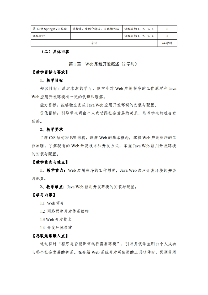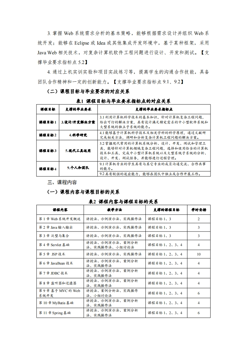 《Web系统开发》课程教学大纲一、课程信息课程名称:Web系统开发Web System Development课程代码:06E4126B课程类别:专业核心课程/必修课适用专业:计算机科学与技术专业课程学时:64学时(含20学时实验)课程学分:3.5学分修读学期:第6学期先修课程:面向对象程序设计、数据库原理及应用、Wb前端技术、数据结构、软件工程二、课程目标《Wb系统开发》是计算机科学与技术专业的一门专业核心课,是有关网络程序设计的较高级内容。通过理论教学、上机实训实验、项目实战练习等教学环节,掌握Wb系统开发的过程、工具与规范方法,为学生将来从事基本Web的系统开发打下坚实的基础。(一)具体目标通过本课程的学习,使学生达到以下目标:1.理解Web应用及开发的基本概念,熟悉Web应用程序的体系结构,掌握JSP、Servlet、JavaBean等技术的语法和应用,掌握使用JDBC访问数据库,掌握MVC模式的工作原理,掌握Mybatis、Spring和SpringMVC三个框架的工作原理,能够应用Java Web技术和MVC模式或某框架,并结合实际问题,对复杂计算机软件工程中的关键问题分析、设计出一套可行的解决方案。【支撑毕业要求指标点3.1】2.能够基于计算机科学技术及相关学科的科学原理,通过文献研究或相关方法,应用MVC模式的基本思想,调研分析复杂计算机工程问题的解决方案。【支撑毕业要求指标点4.1】