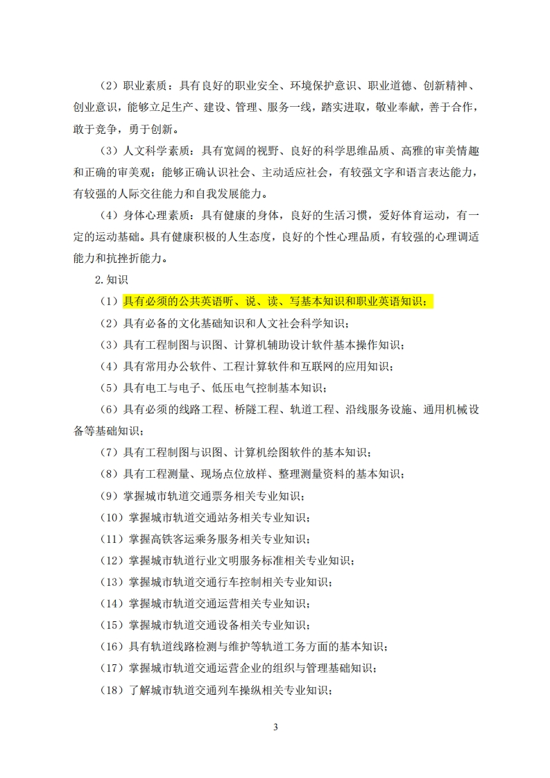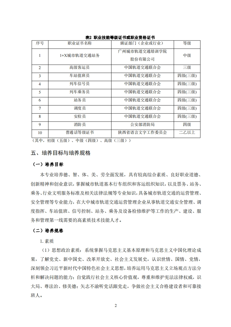 一、专业名称及代码城市轨道交通运营管理(500606)二、入学要求普通高级中学毕业、中等职业学校毕业或具有同等学历者三、修业年限三年四、职业面向与职业资格本专业毕业生主要面向城市轨道交通行业企业单位,包括城市轨道交通公司(包括地铁、轻轨、城际铁路)从事客运组织与服务、行车调度、票务管理、车站设备运用、接发列车、调车等工作,同时也可从事轨道工程施工、测量、维修养护等相关工作。本专业毕业生就业面向的岗位主要有:地铁、轻轨等城市轨道交通车站站务人员(含值班站长、站长等)、行车调度员;铁路站车运输类岗位(如客运管理、售票管理、车站值班员、列车调度、客运列车长等):轨道交通工程施工类岗位(施工员、测量员、养护维修员等)。随着城市轨道交通规模的不断扩大,尤其是西安城市轨道交通一系列新线路的建成和投入运营,必将会带来轨道交通行车组织、客运组织及服务方面的人才需求,为学院面向轨道交通运输生产一线,培养掌握轨道交通行车组织、客运组织及服务技能人才为主的城市轨道交通运营管理专业提供了良好的发展机遇。本专业职业面向如表1所示。表1城市轨道交通运营管理专业职业面向所属专业大类所属专业类对应行业主要职业类别主要岗位类别职业资格证书、技能等级(代码)(代码)(代码)(代码)(或技术领域)证书1+X城市轨道交通站务:高级客运员城市轨道交通服地铁车站站务车站值班员交通运输大类城市轨道交通城市轨道交票务管理务员列车信号员(50)类(5006)通(54)旅客服务列车乘务员(4-02-01-07)行车调度站务员安检员调度员