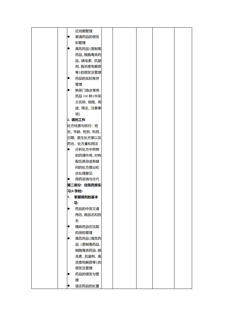《专业实习》课程教学大纲课程基本信息(Course Information)学时课程代码(CoursPHAR3227学分(Credit 642Code)(Credits)Hours)·课程名称(中文)专业实习(临床药学)(Course Name)(Professional Practice (Clinical Pharmacy)课程类型(Course Type)必修课(Compulsory Course)授课对像(Target临床药学专业本科生(Undergraduate Student)Audience)授课语言(Language of全中文(Chinese)Instruction)开课院系药学院(School of Pharmacy)(School)先修课程无(None)后续课程无(None)(Prerequisite)(post)课程网址课程负责人孙海英(Course无(None)(Instructor)(Haiying Sun)Webpage)(中文300-500字,含课程性质、主要教学内容、课程教学目标等)本课程为临床药学专业本科生的实践类教育课程,为必修课。学生将在上海市第一人民医院完成为期一个月的专业实习。掌握调剂(门诊、急诊、住院)静脉调配中心(PIVS)、药品保管(药库)、血药浓度监测以及内外科临床药学工作的基本技能。通过专业实习,一方面可以增强学生的临床实践,明确·课程简介(中药剂科的岗位职责,培养药学情报收集、整理与运用的能力,适应和胜任医院文)(Description)药学工作。另一方面,学生在亲自动手和实操体验中,可以树立劳动观念,获得劳动能力,培育劳动精神,养成劳动习惯和品质。帮助学生树立正确的人生目标,培养立足本岗,乐于奉献的精神。本课程实践“四位一体”的育人理念,使学生成为具有学术追求与科学精神、健全人格与社会责任、人文情怀与国际视野、德智体美劳全面发展的临床药学人才。(英文300-500字)·课程简介(英This course is a compulsory course for undergraduate students majoring in)(Description)clinical pharmacy.Students will complete a one-month professional internshipin Shanghai First People's Hospital.The basic skills of dispensing,PIVAS,drug storage,blood drug concentration monitoring and clinical pharmacy will