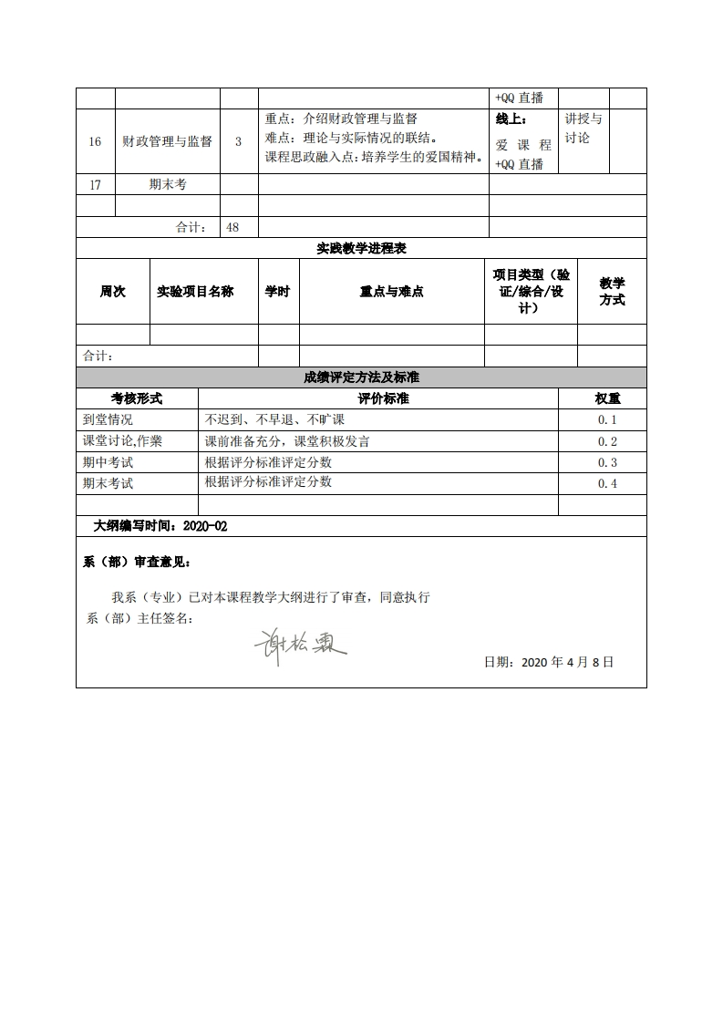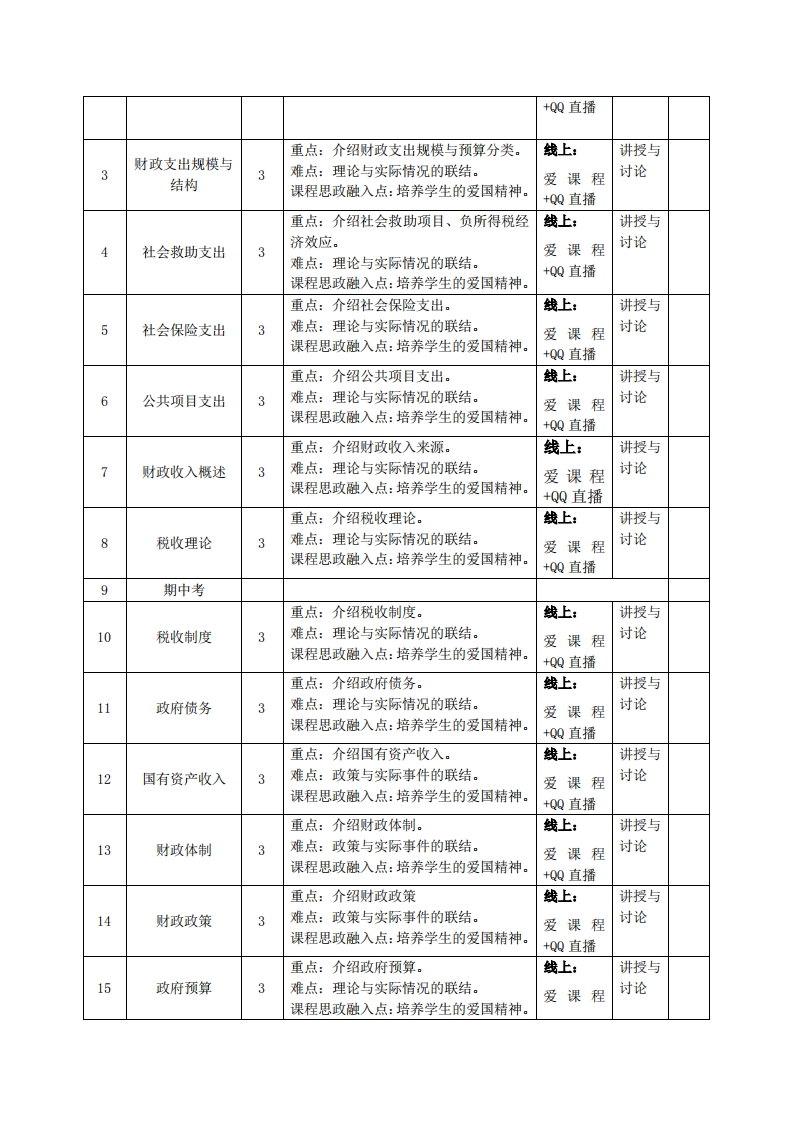 《財政学》课程教学大纲课程名称:财政学课程类别(必修/选修):专业必修课程英文名称:Public finance总学时/周学时/学分:48/3/3其中实验学时:0先修课程:无授课时间:周四/1-3节授课地点:6311授课对象:2018级经济与金融专业1班开课院系:粤台产业科技学院任课教师姓名/职称:江秀燕/副教授少青多联系电话:13427811670Bmai1:2603609544@qq.com答疑时间、地点与方式:周四下午/实验楼204办公室/面授与讨论课程考核方式:开卷()闭卷(√课程论文()其它()使用散材:《财政学》邓子基着,第4版,高等教育出版社。教学参考资料:《西方经济学(宏观部分.第六版)》,高鸿业主编,中国人民大学出版社。《宏观经济学第九版》,曼昆N.Gregory Mankiw)著,卢远瞩译,中国人民大学出版社。课程简介:本课程将详述基础的财政学内容,包含以下内容:1.财政支出规模与结构:2.公共项目支出:3.财政收入:4.财政体制:5.财政政策:6.政府预算:7.财政管理与监督等。以上内容已涵盖财政学最基础的观念,同学可参考上述的2本教材补充学习宏观经济学的相关理论模型。本课程与学生核心能力培养之间课程教学目标的关联(授课对象为理工科专业学生的课程填写此栏):1.莫定同学勇于探索☑核心能力1.2.善于思考☑核心能力2.3.敢于创造财政状况、问题、政策、学理、☑核心能力3.☑核心能力4创新的兴趣、基础、能力和终身学习的驱动力量。☑核心能力5.☑核心能力6.☑核心能力7.☑核心能力8.理论教学进程表周次教学主题教学时长教学的重点、难点、课程思政融入点教学方式教学作业手段安排重点:介绍公共产品、政府职责线上:讲授与市场与效率难点:理论与实际情况的联结。爱课程+QQ讨论课程思政融入点:培养学生的爱国精神。直播重点:介绍财政的本质、双重构成要素钱上:讲授与2双重结构财政3难点:理论与实际情况的联结。爱课程讨论课程思政融入点:培养学生的爱国精神。