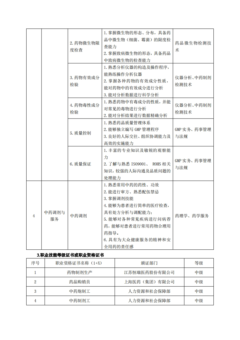 《中药制药》专业人才培养方案一、专业名称及代码专业名称:中药制药专业代码:520415二、入学要求招生对象:高中(中职)毕业生或具有同等学力者招生类型:文理兼收三、修业年限三年。四、职业面向(一)职业能力分析1.专业服务面向通过本专业学习,毕业生主要面向原料药生产、中药制剂生产、药品检验、中药调剂与服务等企事业单位。1)原料药生产(1)中药材规范化生产管理。能进行中药材种植基地建设、无公害药材生产和GAP基地项目申报工作。(2)原料药材的加工炮制及储存养护。指导中药材采收、加工炮制及储存与养护工作。(3)原料药材的鉴别。能对中药材市场上常用的中药材性状进行识别与鉴定。2)中药制剂生产(1)中药材采购。会进行药材采购,能辨识各种中药材(包括原植物,原药材以及加工成的各种饮片)。(2)中药成分提取。熟悉中药材有效成分种类及性质,选择适当的方法将原料药材中的有效成分或有效部位从药材组织中提取出来,并制成相应的提取物(浸膏或干膏粉等)。(3)液体制剂生产。能进行糖浆剂、口服液、注射剂、乳剂等剂型的生产。(4)固体制剂生产。能进行片剂、丸剂、颗粒剂、胶囊剂、散剂的生产。(5)外包装。熟悉包装设计,包装材料的类型,药品外包装要求,会进行液体制剂和固体制剂的包装。(6)质量保证(QA)。主要工作是监督药品从原料进厂到成品出厂的全过程的质量。3)药品检验