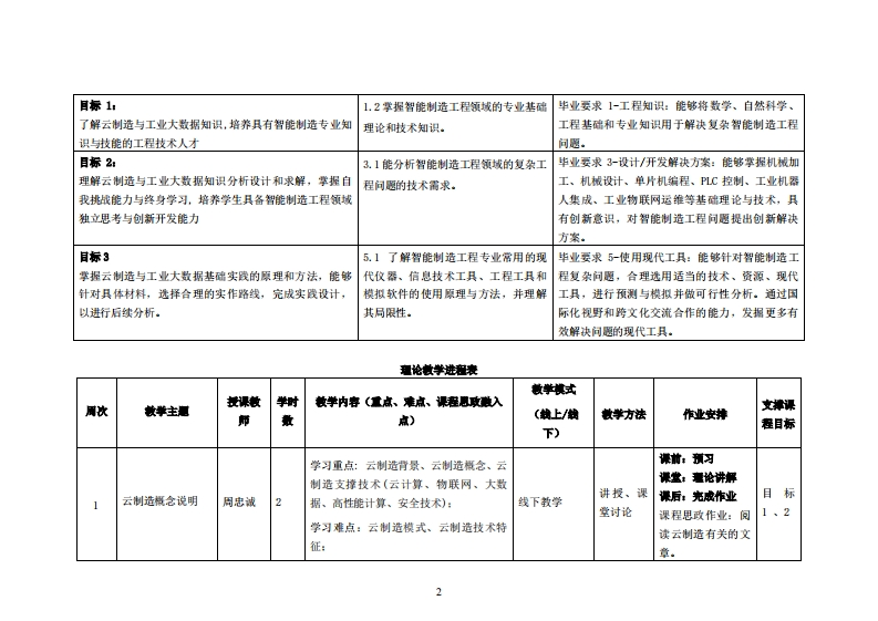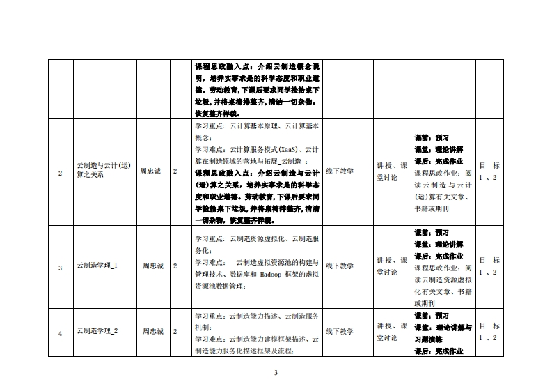 《云制造与工业大数据》教学大纲裸程名称:云制造与工业大数据课把类别(必修/选修):选修课程英文名称:Cloud Manufacturing and Industrial Big Data总学时/周学时/学分:32/2/2其中实险/实我学时4先修课是:高兼学、性代邀·数据分折后续课程支排授裸时间:1-16周周一(3-4节)授课地点:茫城3308课对◆:2021智卷制造1、2班开裸学洗粤合产业科妆学洗任课放柳姓名职称:周忠诚/副教授答票时间、地点与方式:课间_任何时段:课后_预约即可课狸考核方式:开卷()闭卷()课程论文()其它()使用被村:《云计算与大数据技术理论及应用》:林伟伟、彭绍亮主编:清华大学出版社:9787302524458妆学◆考资料:《云制造》,李伯虎、张霖等主编,清华大学出版社,9787302383699:课程情介:本课程闸述了云制造之定义与发展缘由:起于制造业的发展趋势及挑战、制造业信息化过程与云计算:并随着大数据计算服务、人工智能等新技术发展后,再与其就其工业应用、智能制造等面向论述介绍云制造产生骨景、运作环境与依托技术…等项目。在此同时,藉由工业大数据所提供之数据库收集、分析、统计等运算原理与相关技术,可同步配合云制造之智能操作环境,使两者整合成为智能制造之有效工具或平台。最终,藉由实际案例应用说明,使本课程能达到培养学生具有熟悉云制造与工业大数据专业知识:以及应用此知识进行智能制造产业优化或趋势分析判断方法与能力的教学目的.课程妆学日标及对毕业要求指标点的支排课程教学目标支撑华业要求指标点华业要求