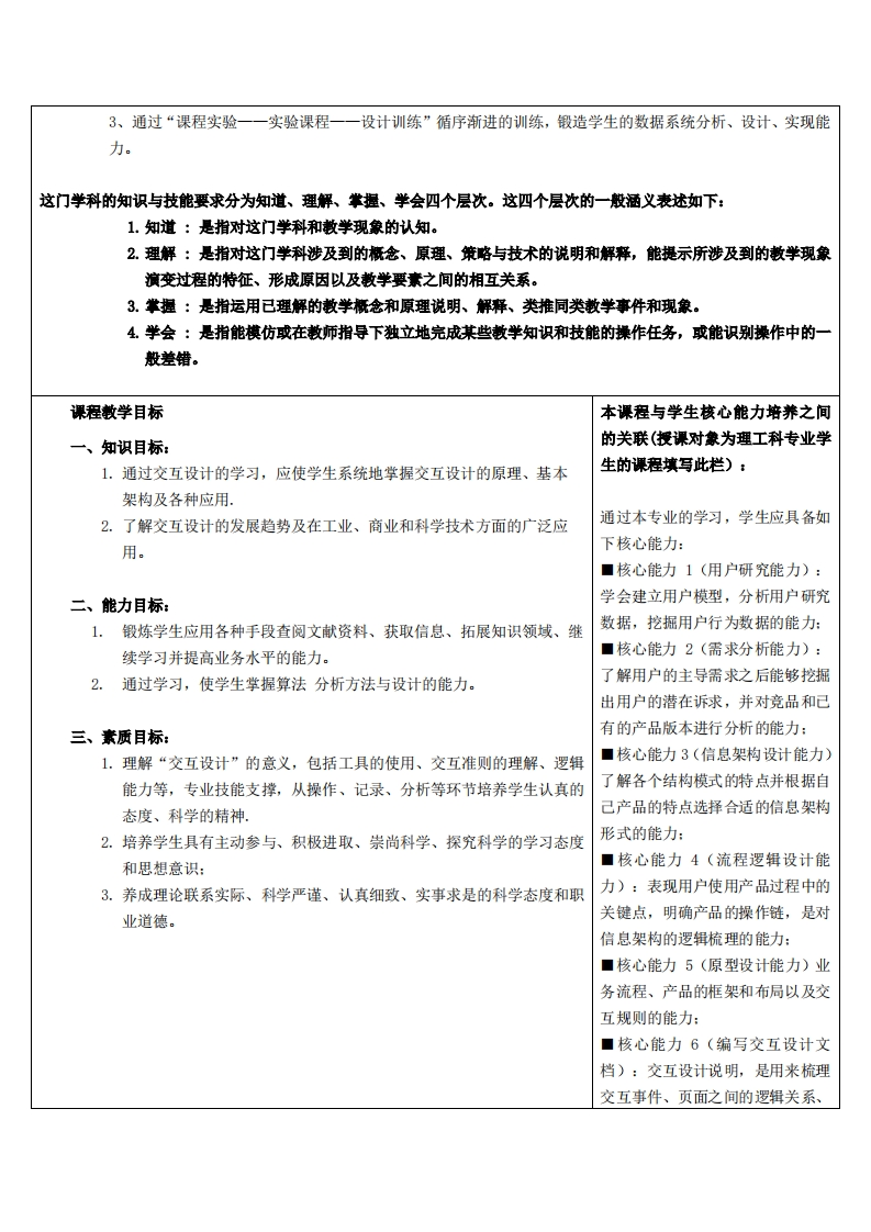 《交互设计》教学大纲课程类别(必修/选修):选课程名称:交互设计修课程英文名称:nteraction Design总学时/周学时/学分:32/2/2其中实验/实践学时:16/0先修课程:授课时间:周一1-2节授课地点:实验楼114授课对象:2021计技设计1班(粤台)开课学院:粤台产业科技学院任课漱师姓名/职称:吴金添/高级工程师、李海/副教授答疑时间、地点与方式:1.每次课的课前、课间和课后,采用一对一的问答方式:2.每次习题课,采用集中讲解方式课程考核方式:开卷()闭卷()课程论文()其它()使用散材:《交互设计概论》作者:李四达,清华大学出版社,2020年:教学参考资料:1、《交互设计精髓》Alan cooper2、《交互设计:以用户为中心的设计理论及应用》Andy Pratt(安迪.普拉特),Jason Nunes(杰森.纽奴斯)著电子工业出版社2015年:3、《交互设计》宋方吴编著国防工业出版社2015年:4、《国际经典设计教程:交互设计》Jamie Steane(杰米●司迪恩)著电子工业:5、《国际交互设计基础教程》(英)迈克尔.萨蒙德,(英)加文.安布罗斯:课程概述1、课程是理论实践课程,所教课程围绕“以人为本”的设计原则,重点讲述人机交互的基本概念和重要意义以及发展历程。2、软件系统的人机交互设计原则和方法、网络系统的人机交互设计原则和方法、人机交互技术与设备、人机交互开发工具与环境。3、简要介绍人机交互的认知心理学、计算机硬件的人机交互设计、人机交互技术的发展趋势,并培养学生利用网络交互设计制作做实际作品的能力。教学目标1、掌握交互设计及其软件的基本概念、基本结构、工作原理及设计方法,最终了解和掌握其工作原理,具有初步的设计能力。2、学会使用设计类工具分析、设计,通过全面培养学生的分析、设计、开发、使用能力,提高学生分析问题、解决问题的自主创新能力。