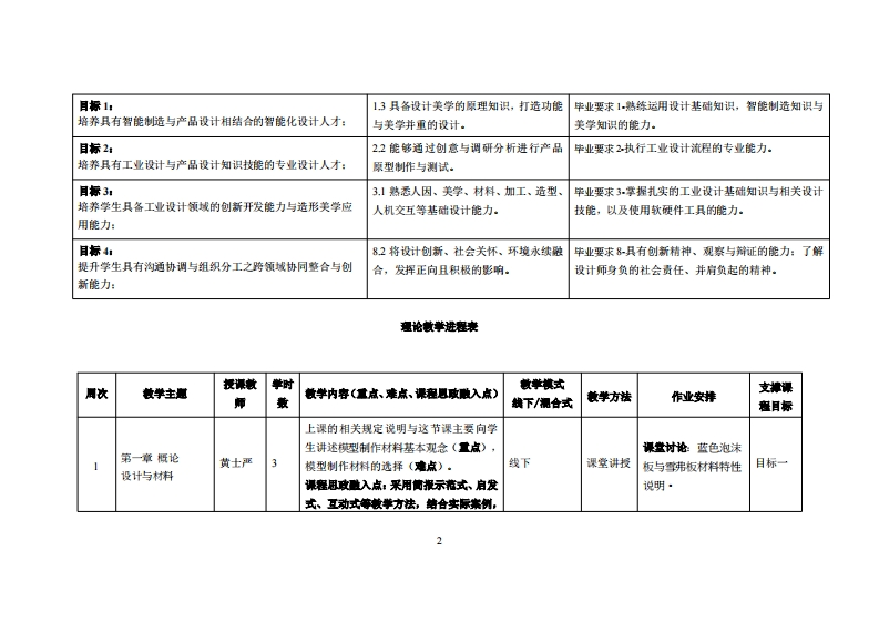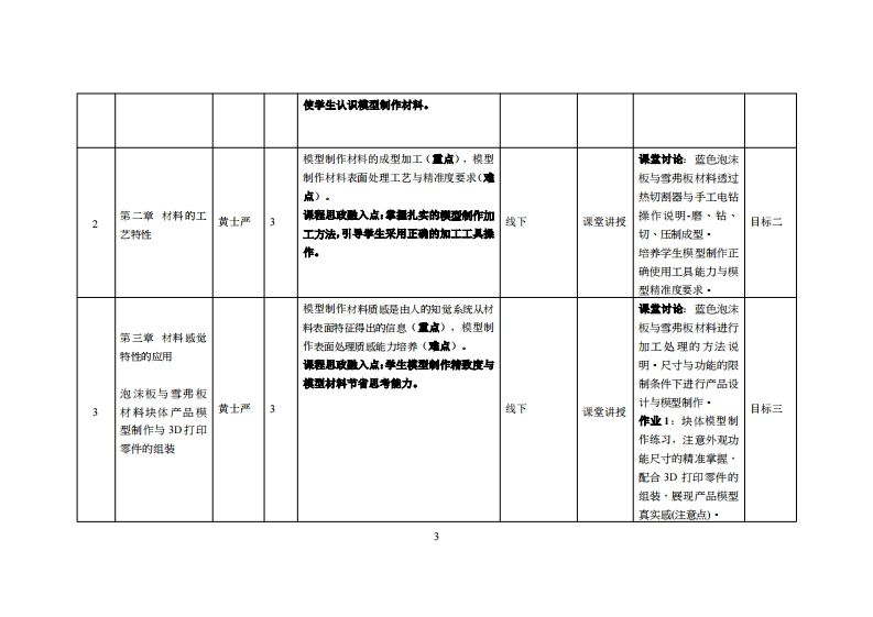 《产品模型制作实务》教学大纲课程名称:产品模型制作实务课程类别(必体选修),被心课程必售课渠容英文名那:Production Practice of Product Model总苹时/周苹时学分:48/3G其中实验实腹举时:36先恤课程:产品设计与横型制作、時顺域设计后续课程支津年设计实务讲座、专■设计、单业设计授课时间:两二13节116周)授课地点:实验楼218机电楼310量课对律:2022鞭工业设计开课学洗:粤合产业科放学洗任课敏师姓名职称:黄士严教授答景时间、地点与方式周四1-2节/实202课程考核方式:开港()闭卷()课程论文()其它()使用教材:《设计材料与工艺》,张钟风着,机城工业出版社,2024年03月1SBN:9787111742128教苹拿考资料:《产品速型设计材料与工艺),超占四肯明字何灿游等着,机城工业出版社,2024年2月第3胶1SBN:9787111741855课容情介:本课程讲进内客以标论、木材与工艺、业料与工艺、金属与工艺等为主要就桌看盖了设计城村料和成形工艺方面的盖本知识、基本建论和基本技能。课中每种材料事附有设计应用案例分折为全面掌材料的性能及使用方法端供了很好的借整。上课以实际动手操作现型村料为主,将其应用于产品设计与膜型的作过程练习·课程敏举目标及对毕业要求指标点的支排:课程敏学目标文津单2要求指标点单业要求