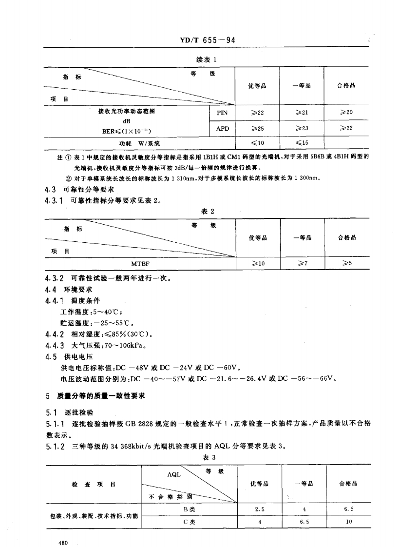 中华人民共和国通信行业标准YD/T655-9434368kbit/s光端机质量分等标准1主题内容和适用范圈本标准规定了34368kbit/s光端机的质量等级及其要求。本标准适用于34368kbit/s光端机,是考核34368kbit/s光端机产品质量等级的依据。本标准不适用于产品分选。2引用标准GB/T12707工业产品质量分等导则GB2828逐批检查计数抽样程序及抽样表(适用于连续批的检查)GB2829周期检查计数抽样程序及抽样表(适用于生产过程稳定性的检查)GB/T139972048kbit/s,8448kbit/s、34368kbit/s、139264kbit/s光端机技术要求GB2423电工电子产品环境试验规程YD282邮电通信产品通信设备可靠性通用试验方法3质量分等34368kbit/s光端机的产品质量水平划分为三等:优等品、一等品和合格品。其划分原则应符合GB/T12707第2章的规定。4质量分等要求4.1基本要求三种等级的34368kbit/s光端机的技术要求首先应符合GB/T13997的规定。4.2主要技术指标的分等要求主要技术指标的分等要求见表1。表1等指标级优等品一等品合格品项目平均发送光功率稳定度(LD光源),dBm设定值士0.4设定值士0.7设定值士1.0PIN≤-46≤-43≤-40接收机灵敏度放长850nmAPD≤-52≤-51≤-50dBm莜长1310nmPIN-40BER(1X10-)≤-44≤-42或1300nm邮电部1994-05-21批准1994-05-21实施