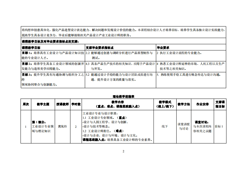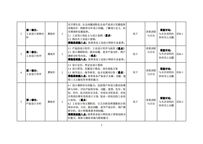 《产品设计》教学大纲课程名称:产品设计课程类别(必修选修):必修课程英文名称:Product Design总学时/周学时/学分:48/3/3其中实验实陵学时:32先修课程:创新思维、工程制图后续课容支罐:产品文化与市场调研授裸时间:周三1-3节1-16周授课地点:实406投课对律:2024级工业设计开课学晓:粤台产业科技学院工业设计系任课教师姓名/职称:黄岚铃/副教授答疑时间、地点与方式:时间(课堂、课外)、地点(实验楼307)、微信)、方式(面谈、微信)潭程考技方式开卷()闭港()课程论文()其它〔√)使用敏材:《现代产品设计开发》,金涛、李淑江编,机械工业出版社,2023年,ISBN:978-7-111-72203-8放学◆考资料:课程黄介:本课程为工业设计系二年级的核心课程,是设计理论和设计实毁的综合体。本课程内容目的是以产品的创意设计为重点,落实工业设计程序,培养初入工业设计的学生具备工业设计思维、工业设计程序,以及工业设计实践能力。通过对现在式的生活产品发展趋势和对来来生活趋势的探讨,以现有产品为案例,从问题发现、市场调查、产品分析、设计思考、创意概念、设计模型等实毁创作,启发学生对设计主题的思考力、造型独创性、设计创造能力和材料的应用塑造能力。设计项目侧重于产品创憶、设计价值、功能、静态结构与造型的关系、认识技术知识等设计分析,从设计专业性提出解决方案,