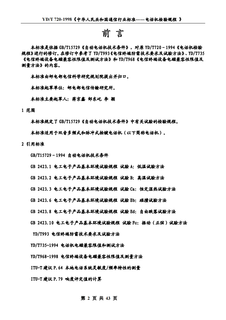 YD-T720-1998348072@abc4个月前发布关注私信0.64MB43页021YD-T720-1998此内容为付费资源,请付费后查看¥13¥23黄金会员免费钻石会员免费立即购买您当前未登录!建议登陆后购买,可保存购买订单付费资源 第1页 / 共43页 第2页 / 共43页 试读已结束,还剩41页,您可下载完整版后进行离线阅读 THE END标准规范 文本预览 中国通信标准2006.06.10commspec中华人民共和国通信行业标准YD/T720-1998电话机检验规程中华人民共和国信息产业部发布 查看更多 收起部分 喜欢就支持一下吧收藏