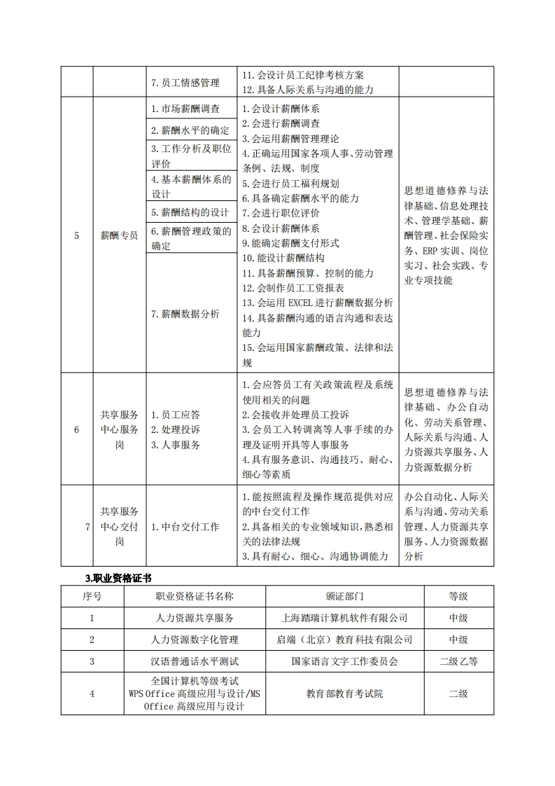 《人力资源管理》专业人才培养方案一、专业名称及代码专业名称:人力资源管理专业代码:590202二、入学要求招生对象:高中(中职)毕业生或具有同等学力者。招生类型:文理兼收。三、修业年限三年。四、职业能力分析(一)职业能力分析1.专业服务面向(1)初始就业岗位行政办公文员、招聘专员、培训专员、人力资源信息管理员、绩效与薪酬管理专员、劳动关系专员、档案管理员:人力资源共享服务中心的服务岗、交付岗。(2)目标就业岗位行政经理、人力资源经理、人力资源专项工作(招聘、培训、绩效、薪酬、劳资等)经理、行政人力总监或副总;人力资源共享服务中心的管理与规划岗。(3)就业范围中小型企业或事业单位、人力资源服务公司(培训、咨询、劳务派遣、人才招聘等)、基层人力资源与社会保障或民政部门、人力资源共享服务中心。2职业岗位与职业能力分析序号工作岗位典型工作任务职业能力支撑课程1.工作分析1.会运用劳动法律法规和相关政策思想道德修养与法2.人力资源规划2.会编写工作说明书律基础、信息处理技3.能够进行人力资源规划3.招聘计划的制定术、军事、管理学基4.会制定招聘计划础、基础会计、公共4.人员招募5.会制定招聘相关表格关系、工作分析、人招聘专员6.能从事人员招聘工作5.人员甄选员招聘与配置、ERP7.能从事人员甄选工作实训、岗位实习、职6.人员录用8.会运用人员录用流程及注意事项业生涯与发展规划、进行人员录用7.招聘评估就业指导、创新创业9.会进行招聘评估实践、专业专项技能8.人力资源配置10.能合理配置人力资源
