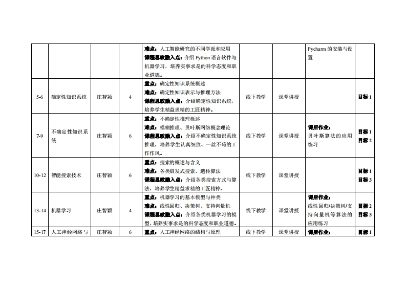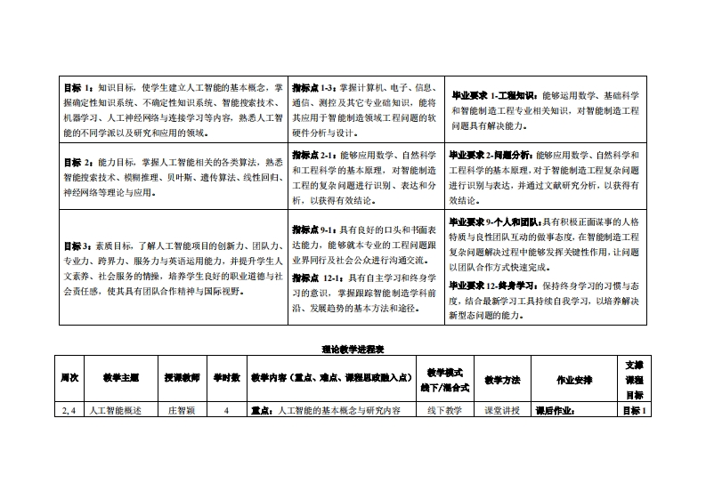 《人工智能》教学大纲裸名称:人工智能课忍类别(必修选修)必修课程英文名称:Artificial Intelligence总学时周学时学分,3222其中实险实液学时,0先修课塞:无后续课程支撑人工智能技能及应用、机器视觉技术漫课时间:2周、4至18周星期五56节授课地点:莞城5208课对律:2021智能制造1班、2班开裸学洗:粤台产业科技学院任课放甲姓名林:庄智领/副教授答展时间、地点与方式:1每次课的课前、课间和课后,采用一对一的问答方式:2每次习题课,采用集中讲解方式。课狸考核方式:开卷()闭港()课程论文()其它(√)非试港类报告使用材:《人工智能原理及其应用》,王万森,电子工业出版社,1SBN:978712134435.课难信介:本课程介绍人工智能的基础概念,应用Pym语言来实现一些人工智能的算法应用。包括确定性知识系统、不确定性知识系统、智能搜索技术、机器学习、人工神经网路与连接学习等。人工智能是当前科学技术中正在迅速发展,新思想、新观点、新技术不断涌现的一个学科,也是一门涉及许多方面诸如数学、计算机科学、控制论、信息论、心理学、哲学等的学科,其研究如何用机器来模仿人脑所从事的推理、证明、识别、理解、学习、规划、诊断等智能活动。课程放学目标及对华业要求指标点的文排:课程妆学目标支撑毕业要求湘标点单业要求