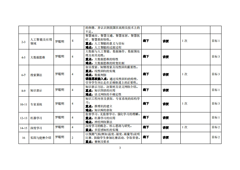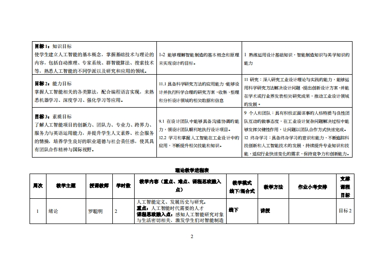 《人工智能》教学大纲课程名称人工智能课和类别(必修选修),通识必修课程英文名称:Artificial Intelligence总学时周学时学分,322/2其中实检实减学时,0先修课程:高等数学、线性代数后续课程支撑机器视觉技术、人工智能技术及应用漫课时间:1-16周星期二34节授地点:莞城3407课对律:23工业设计1班,23计技设计1班开裸学瑰:粤台产业科技学院任课妆柳姓名琳:罗聪明副教报容鞭时间、地点与方式:课后的1-2节课、实验楼307、面答/微信稀是考恢方式:开卷()闭卷()课程论文()其它():报告使用微村,周苏,张泳,人工智能导论,机械工业出版社,2020年3月妆学事考资料:王健,赵国生,赵中楠,人工智能导论,机械工业出辰社,2021年10月。课程物介:《人工智能》课程是高等院校相关专业的重要课程,按涉入各个内容深广的不同,可以概分为导论、进阶应用两部分,本课程为先修导论内容,包括:引言、基础知识(大数据思维、搜索算法、知识表示)、基于知识的系统(专家系统、机器学习、深度学习)、高级专题(机器人技术、智能图像处理、自然语言处理、自动规划)等方面。通过本课程的教学,使学生了解人工智能的相关概念、理论与应用,帮助学生扎实地打好人工智能的知识基础。课程妆学目标及对单业要求指标点的支排课程放学目标支撑毕业2要求指标点单业要求