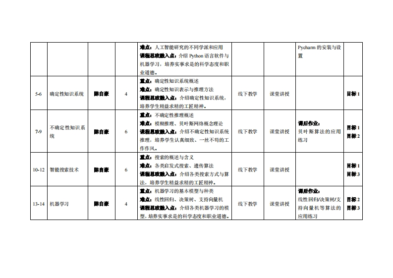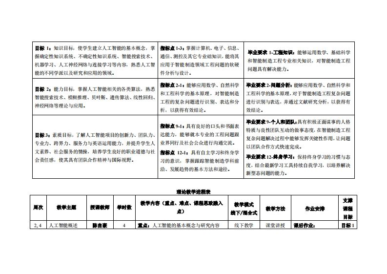 《人工智能》教学大纲裸课名称:人工智能课忍类别(必修选修)必修课程英文名称:Artificial Intelligence总学时周学时学分,3222其中实险实液学时,0先修课塞:无后铁课程文排人工智能技能及应用、机器视觉技术提课时间:2周、4至18周星期四1-2节提课地点:端6302提裸对桌:2021电商、工业设计班:开课学跳:粤台产业科技学院任课微师姓名蒂:陈自素/副教报答果时间、地点与方式:1每次课的课前、课间和课后,采用一对一的问答方式:2每次习题课,采用集中讲解方式。课是考方式:开卷()闭港()课程论文()其它(√)非试港类报告使用村,《人工智能原理及其应用》,王万森,电子工业出版社,ISBN:9787121344435。课程简介:本课程介绍人工智能的基础概念,应用Py即语言来实现一些人工智能的算法应用。包括确定性知识系统、不确定性知识系统、智能搜索技术、机器学习、人工神经网络与连接学习等。人工智能是当前科技术中正在迅速发展,新思想、新观点、新技术不断涌现的一个学科,也是一门涉及许多方面诸如数学、计算机科学、控制论、信息论、心理学、哲学等的学科,其研究如何用机器来模仿人脑所从事的推理、证明、识别、理解、学习、规划、诊断等智能活动。课程微学目标及对毕业要求州标点的支撑:课程敏学目标支撑单业2要求治标点单业要求