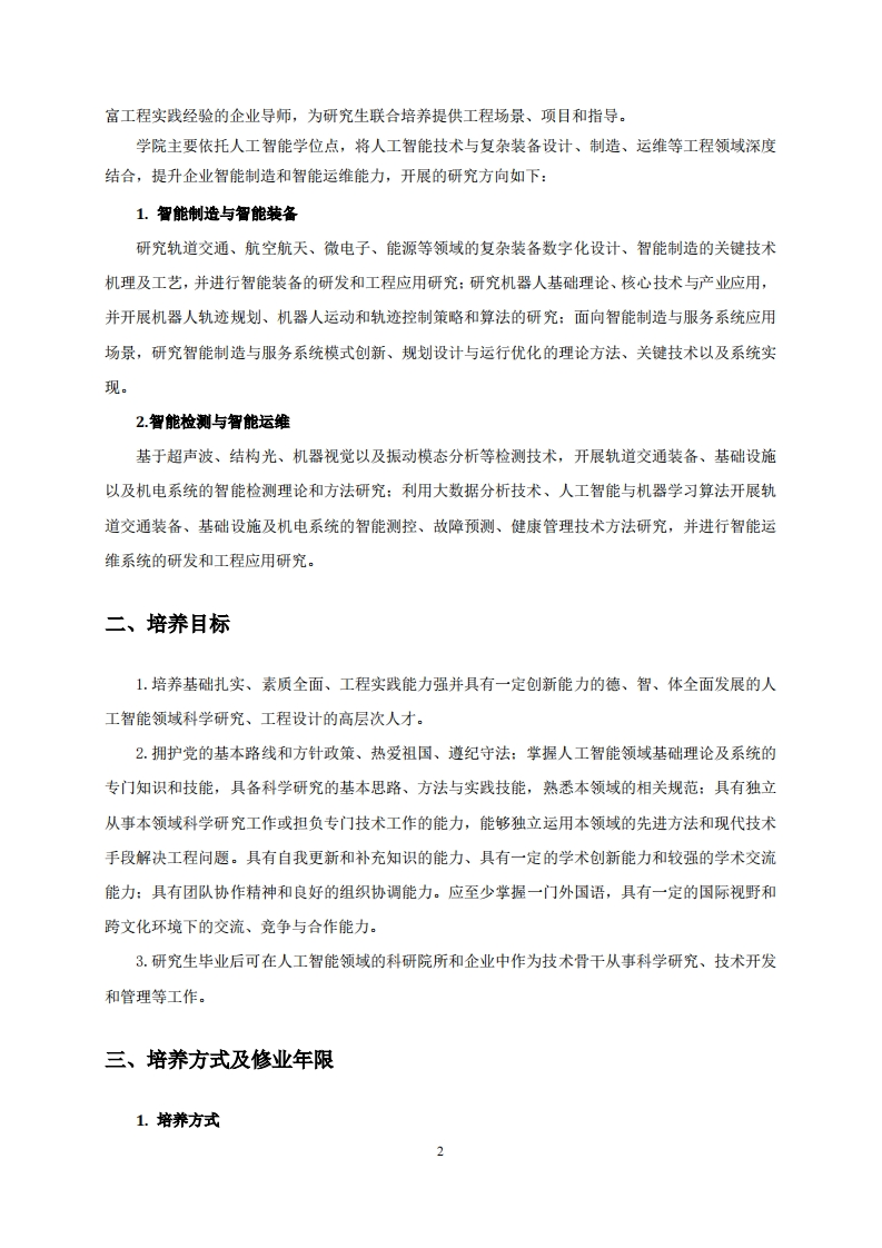 人工智能(专业代码:085410授予电子信息硕士专业学位)机械与电子控制工程学院一、专业类别(领域)简介电子信总息是与电子、通信、控制、计算机、电气、软件、光电、仪器仪表等专业领域,以及网络空间安全、人工智能、虚拟现实、集成电路、大数据与云计算、物联网、生物信息、量子信息等新兴方向紧密关联的专业学位。人工智能是研究使机器模拟、延伸和扩展人类智能的学科,是计算机科学、哲学、数学、神经科学、心理学和语言学的学科思维与知识汇交的新兴交叉学科。人工智能研究涉及基础理论、关键技术与行业应用等,具体包括问题求解、学习、知识、推理、感知、认知、规划和行为等人工智能基础理论与方法,自然语言处理与理解、计算机视觉、信息检索、机器人、自主无人系统、混合智能和智能芯片等关键技术,以及交通、通信、城市、工业、金融、医疗和教育等的人工智能行业与学科交叉应用。北京交通大学人工智能硕士专业学位点以计算机科学与技术、通信与信息系统、控制科学与工程等一级学科为依托,重点研究机器学习、大数据与知识工程、智能感知与理解、智能信息处理、智慧交通和智慧能源等技术,旨在培养从事与人工智能相关的技术开发和管理等方面的高级专业人才。人工智能专业学位的培养,以计算机科学与技术、通信与信息系统等A类一级学科为优势,以交通科学与技术为特色,研究人工智能关键技术及其在交通和能源等行业的交叉应用。北京交通大学和学位点依托企业(中国国家.铁路集团有限公司、国家能源投资集团有限责任公司、中国铁道科学研究院集团有限公司)拥有深厚的合作基础,中国国家铁路集团有限公司、国家能源投资集团有限责任公司、中国铁道科学研究院集团有限公司是北京交通大学的优秀产学合作基地,共同培养了多批研究生:北京交通大学与上述企业在人工智能前沿技术研发方面承担了多项国家级的科研项目,合作产出了多项重要研究成果。机械与电子控制工程学院依托人工智能学位点,围绕智能制造与智能运维开展专业学位研究生培养,致力于轨道交通、智能制造、国防科技、新能源动力技术、先进材料等领域的科学研究,拥有国家级国际科技合作示范基地、结构强度检测国家认可实验室、教育部重点实验室、北京市重点实验室、行业重点实验室等8个国家和省部级科研平台。拥有一批智能制造、智能运维、机器人等领域的知名专家教授组成的高水平师资队伍,可以为研究生提供了很好的实验条件和研究环境。学院依托中国国家铁路集团有限公司、国家能源投资集团有限责任公司、中国铁道科学研究院集团有限公司等企业开展人才联合培养,拥有一批在智能制造、智能运维等领域掌握行业关键技术、具备丰
