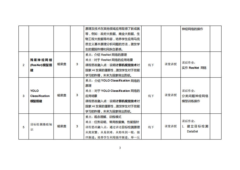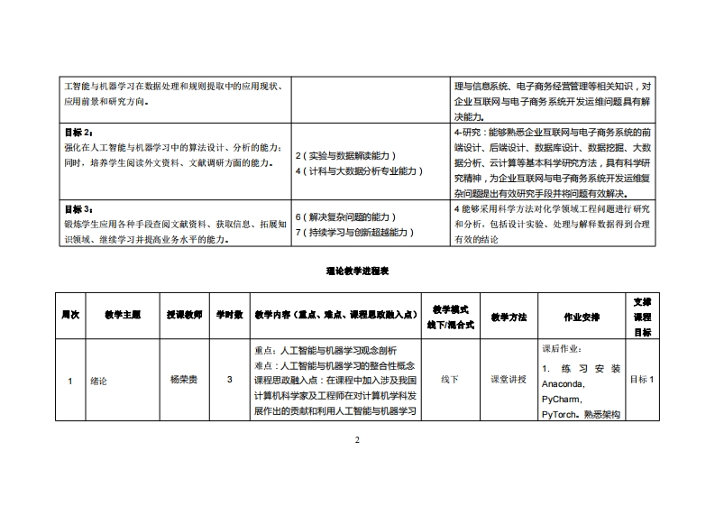 《人工智能与机器学习》教学大纲裸程名称:人工智能与机得学习课程类别(必修选修),必修课程英文名称:Artificial Intelligence and Machine Leaming总学时周学时学分,481313其中实险实我学时:16先修课是:具备Python程南语言、数据结构、基础的数学和统计学知识.后续课程支撑:毕业设计授课时间:星期一(7-8拘1-16周,星期五(34拘916周授课地点:机房503提课对津:23电商1-2班开课学洗:粤台产业科技学院任课敏即姓名职淋:杨荣贵副教授答鞭时间、地点与方式:课堂或课后,教室或通讯软件,当面或线上答疑课程考核方式:开卷()闭卷()课程论文()其它()作业、期末报造使用微材《人工智能算法与实战(Python+-PyTorch)》,于祥雨、李旭静、邵新平,清华大学出版社,第1版,救材1SBN:9787302557821妆学考资料:《PyTorch生成对抗网络编程》,韩江需,人民邮吨出版社,出版日期:2020.12,1SBN:9787115546388课程简介:人工智能(A)与机器学习(ML)课程通常涵盖广泛的主题,台在让学生理解和应用这两个领域的基本概念和技术。课程内容将通过讲座、实际项目、案例分析和讨论来传授.学生将有机会使用流行的机器学习工具和框架,例如TensorFlow、.PyTorch和Scikit--eam,以实际动手经验深化他们的理解。课程做学目标及对毕业要求指标点的支排:裸程妆学目标支撑单业要求指标点单业要求目标1:1.交叉知识的运用能力1-工程知识:能够运用数学、基础科学、计算机科零握人工智能与机器学习的基本概念、相关技术,了解人3.(技术工具的应用能力)学与技术企业互联网平台系统、电子商务信息管