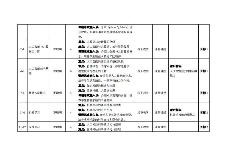 《人工智能技术及应用》教学大纲裸寇名称,人工智能技术及应用课和类别(必修选修),选修课程英文名称:Artificial Intelligence Technology and Its Application总学时周学时学分,3222其中实险实液学时,4先修课是:人工智能后续课程支撑无人机设计组装与制作漫课时间:1至16周星期一34节,星期三34节授裸地点:实606机圆课对津:2022智能制造1,2班开裸学陕:粤台产业科技学院任课就姓名称:罗聪明/副教授答展时间、地点与方式:1每次课的课前、课间和课后,采用一对一的问答方式:2每次习题课,采用集中讲解方式。课狸考楼方式:开卷()闭港()课程论文()其它(√)非试港类报告使用藏材:《人工智能原理、技术及应用》,安俊秀叶剑陈宏松,机械工业出版社,SB:9787111707776。课难信介:本课程对人工智能相关知识进行了详细讲解,并应用Pyn或Matlab语言来实现一些人工智能的算法应用。首先对人工智能进行概述,使同学们了解人工智能的起源及发展趋势,对人工智能的应用和新发展有一定了解:接者对人工智能的基础技术、理论进行详细讲解,使同学们对这方面知识形成全局认识:在明晰基本理论的前提下,再对具体的机器学习、深度学习、强化学习等内容进行具体介绍,并且穿插了相应的实践案例,使同学们有更直观的认识,实现了理论与实践的结合。课程放学目标及对华业要求指标点的文排:课程妆学目标支撑毕业要求指标点单业要求