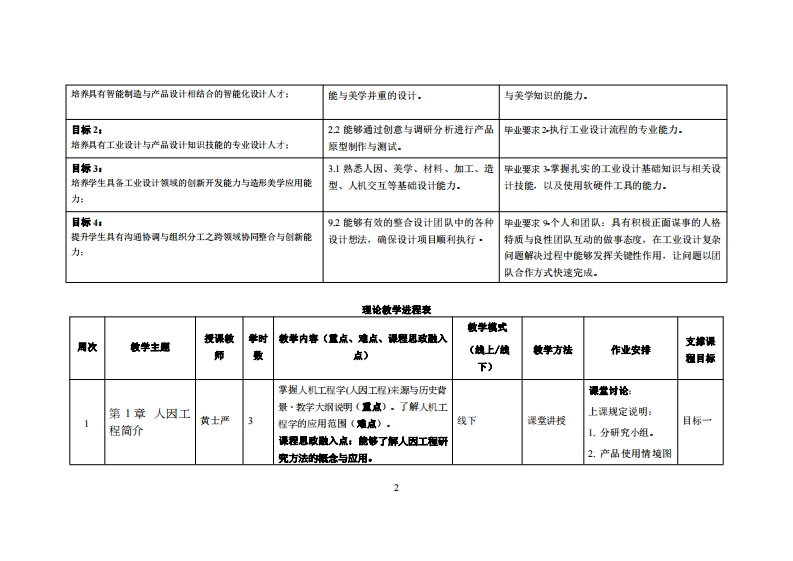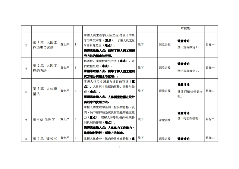 《人机工程学》教学大纲裸程名称:3311193人机工程学课程类别(必修选修),核心双语课程课程英文名称:Erg0n0mlcs总学时周学时/学分,483/3其中实险实戒学时:16先修课程:设计素描、机械制屈与计算机轴助工业设计后续课程支撑:跨城设计、设计心理授课时间:周四13节(1-16周)提课地点:实218提课对津:2023领工业设计开课学洗:粤台产业科技学陕任课师姓名只淋:黄士铁授答鞭时间、地点与方式:实202周二三7节课图考核方式:开卷()闭卷()课程论文()其它()使用妆材:《人因工程:英文》,纽建伟主编,北京:电子工业出版社,2021年03月1SBN:978-7-121-407734妆学参考度料:《设计中的人机工程学》,葡悦着,机械工业出版社,2020年04月1SBN:9787111642329课是情介:人机工程学主要针对高校本科工业设计专业人机学的基本理论、基本方法外,“人机工程学”中所莎及“人因工程学”的知识点同设计学的研究与实腹结合,以“人因工程学”的知识理论作为善德,指导设计举领城的“人、机、环境”等设计目标的实现。主要内喜包括包括振论,人因工程研究的主流方法。人体测量的振意、人体的生理机能·人体夜劳与肌青失调、职业生物力华、视觉系统、听觉系统特点和应用,视觉显示系统、显示设计基本原则、导航是示设计。本书氏可以学习人因工程举的基本理论和基磁知识,更能通过大量实例掌复人机工程举的科研思略与实度方法。课程妆学目标及对毕业要求指标点的支排:裸和妆学目标(以《化学反应工程)为例支撑单业要求指标点单业要求目标1:13具备设计美学的原理知识,打造功毕业要求1熟练运用设计基础知识,智能制造知识