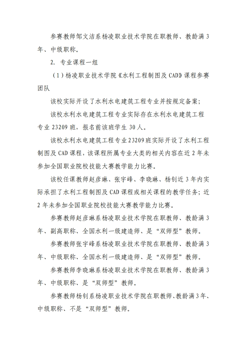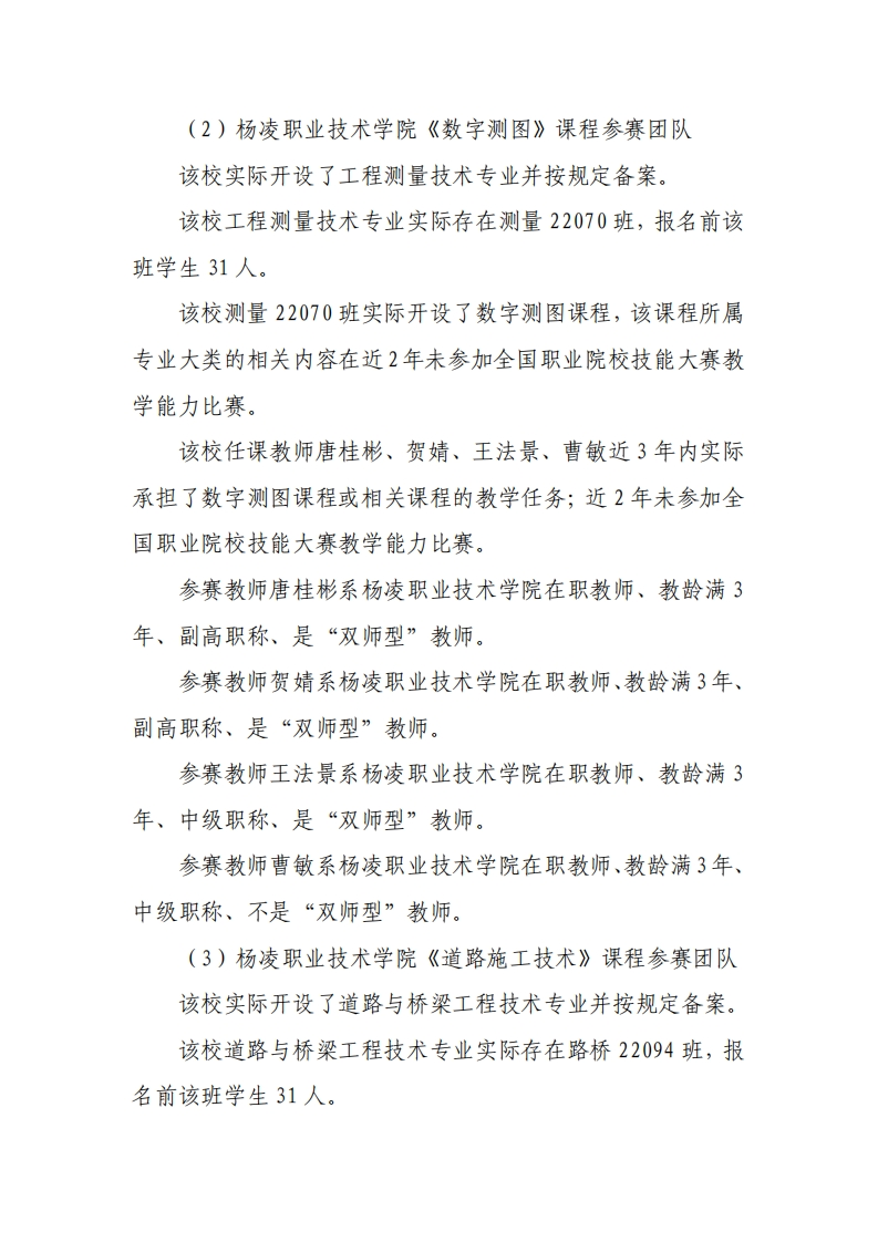 附件22024年陕西省职业院校技能大赛教学能力比赛杨凌职业技术学院参赛团队信息公示二、高职组1.公共基础课程组(1)杨凌职业技术学院《应用英语》课程参赛团队该校实际开设了城市轨道交通运营管理专业并按规定备案;该校城市轨道交通运营管理专业实际存在城运23039班,报名前该班学生31人。该校城运23039班实际开设了《应用英语》课程,该课程所属专业大类的相关内容在近2年未参加全国职业院校技能大赛教学能力比赛。该校任课教师聂佳、李凯、何憬、邹文洁近3年内实际承担了《应用英语》课程或相关课程的教学任务;近2年未参加全国职业院校技能大赛教学能力比赛。参赛教师聂佳系杨凌职业技术学院在职教师、教龄满3年、中级职称。参赛教师李凯系杨凌职业技术学院在职教师、教龄满3年、副高职称。参赛教师何憬系杨凌职业技术学院在职教师、教龄满3年、中级职称。