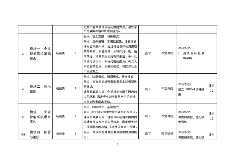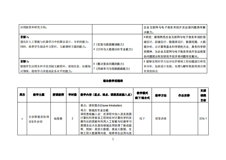 《企业智能系统项目实作》教学大纲课应名称,企业智能莱统项目实作课忍类别(必修选修):任选课项目类课度课程英文名称:Enterprise Intelligent System Project Implemen妇iom总学时周学时学分,32/2/2其中实检实艘学时,仿先继课是:具备移动应用开发、计算机网络与适讯、Py0与大数据分析知识。后续课程支排毕业设计授课时间:1-格周星期三(1-2节)授课地点:机房05课对津:21电商1班开裸学陕:粤台产业科技学院任课就即姓名职游:杨荣贵副教授答时间、地点与方式:课堂或课后,教室或通讯软件,当面或线上答疑课程考黄方式:开卷()闭卷()课程论文()其它()作业、期末报告使用微村,《PyTa生成对抗网络编程》,韩江雷,人民邮电出版社,出版日期:202012,1S8N:9787115546383妆学事考资科:1。各精品资源共享课网站。课程物介:本课程台在帮助学生深入理解和实际应用企业智能系统的概念、原理和技术。通过项目实作,学生将有机会亲身参与企业智能系统的设计、开发和实施过程,从而培养实际应用技能和解决实际业务问愿的能力。课程放学目标及对毕业要求指标点的支排:课应妆学日标支撑单业要买求指标点单业要求目标1:1工程知识:能够运用数学、基础科学、计算机科1交叉知识的运用能力掌握人工智能与机器学习的基本概念、相关技术,了解人学与技术、企业互联网平台系统、电子商务信息管3(技术工具的应用能力)工智能与机器学习在数据处理和规则提取中的应用现状、理与信息系统、电子商务经营管理等相关知识,对