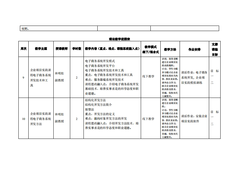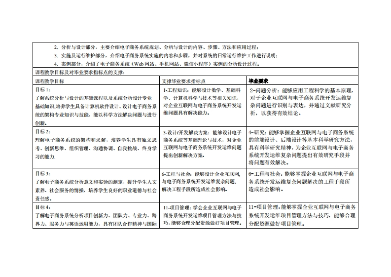 《企业项目实践》教学大纲课应名称,企业项目实腰课忍类别(必修选修),必修项目类课和课程英文名称:Enterprise Project Practice总学时周学时学分,322/2其中实险实液学时:先能课是:JAVA语言应用开发后续课程支撑量据花调与数据仓库授课时间:避论授谦916周,■期四910节,授课地点:-16周,■期四9-10节,6208数速架中实浪放学13周6月12日,18节13周,6月1-2日,1-8节,实验楼207106.视课对缘:2022计算机科学与技术水時烤电商电商12班粤)开裸学洗,粤合产业科技学陕任课效即姓名称:林明灶/测就授容振时间、地点与方式:1.理论授课9-16周,星期四9-10节,地点6208教室;集中实践教学:13周,6月1-2日,1-8节.采用集中授课及讲解辅导,实验楼207106.。2.每次课前和课后,实验楼307,采用一对一的问答方式。课狸考核方式:开卷()闭港()课程论文()其它(√)使用数村:《信息系统分析与设计》,杜州、赵膏艳、王洪英、屈膏池、赵晶晶,第3版,SBN9787302576433,清华大学出版社。妆学考责料:1.各着品资漂共率课同站。课程简介:本企业项目实践课程介绍当前企业电子商务系统的两种主流开发方法为主线,系统地介绍电子商务系统的相关概念以及电子商务系统规划、分析、设计、实施和运行维护的内容、步骤、技术及工具,运用课程所学知识,进行系统规划,完成电子商务系统分析规划书之企业项目实践在结构上分为4个部份:1,基础部分,主要介绍电子商务系统的基本概念、常用开发方法及开发工具: