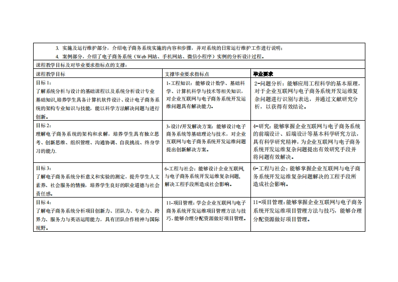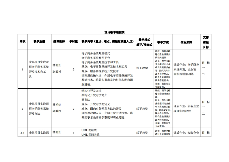 《企业项目实践》教学大纲课意名称:业项目实装课和类别(必修选修),必修项目类课和课程英文名称:Enterprise Project Practice总学时周学时学分,322/2其中实检实减学时,16先继课是:JAVA语言应用开发后续课程支撑量据艺调与数据仓库授课时间:116周,基期四34节授裸地点:机电楼401提课对津:2023计算机科学与技术诗携电商电商1-2班事台)开裸学瑰:粤合产业科妆学陕任课妆师姓名淋:林明灶/测敏授鞭时间、地点与方式:1.采用集中授课及讲解辅导,实验楼307/207.2.每次课前和课后,实验楼307,采用一对一的问答方式。课程考被方试:开卷()闭港()课程论文()其它(√)使用教材《信惠系统分析与慢计》,广浩德、帘意、骨林、向海肉、张每、李地、举峰、产汉喜,第3版1SBN9787302673767,清华大学出版社。妆学◆考度料:1.各精品资漂共率课网站。课程简介:本企业项目实践课程介绍当前企业电子商务系统的两种主流开发方法为主线,系统地介绍电子商务系统的相关概念以及电子商务系统规划、分析、设计、实施和运行锥护的内容、步骤、技术及工具,运用课程所学知识,进行系统规划,完成电子商务系统分析规划书之企业项目实践在结构上分为4个部份:1,基础部分,主要介绍电子商务系统的基本概念、常用开发方法及开发工具:2分析与设计部分,主要介绍电了子商务系统规划、分析与设计的内容、步骤、方法和应用过程: