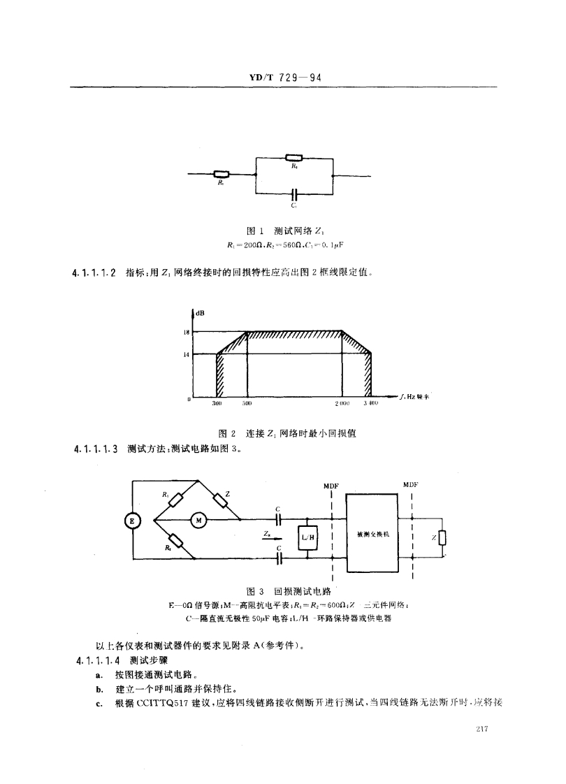 中华人民共和国通信行业标准YD/T72994程控用户交换机进网检测方法1主题内容与适用范围本标准规定了用户交换机的进网检测方法及网上质址跟踪所遵循的统·要求。本标准适用于数字程控用户交换机和模拟程控用户交换机。2引用标准GB3971.2电话自动交换网局间中继数字型线路信号方式GB3377电话白动交换网多频记发器信竹方式GB3378电话自动交换网用户信岁方式GB3379电话自动交换网局间貞流信号方式GB7611脉冲编码调制通信系统网路数字接口参数GB68792048kbit/s30路脉码调制复用设备技术要求GF002邮电部电话交换设备总技术规范书YD344自动用户交换机进网要求3公共测试亲件3.1测试界面均以配线架交换机接口端为准,扣除各种操作系统误差。3.2开始测试前均应做好公共地线并以电源“+”接入大地。3.3参考基准频率:数字交换机1020Hz,模拟交换机800H2参考基准电平:数字交换机一10dBm0,模拟交换机0dBm.3.4各种测试均应在所要求的阻抗匹配茶件下进行。3.5测试工作电流一般选25-35mA为宜。3.6传输指标每种参数测四次,其结果取最差值,若有不合格的指标应加倍复测。3.7测试应在正常工作环境下进行。3.8所用仪器设备均应在计量合格有效期内。4接口测试4.1数字程控用户交换机4.1.1二线模拟接口Z4.1.1.1阻抗特性4.1.1.1.1接口点测试网络Z,如图1.中华人民共和国邮电部1994-07-20批准1995-01-01实施216