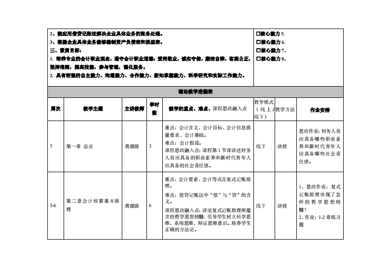 《会计学原理》教学大纲课程名称:会计拳原理课程类别(必修进修),必修课程英文名赫:principles ofaccounting总学时周学时学分:48,3/3其中实验实藏学时,9先无修课程:菱裸时间:是期三(911节)(第1-16周)授裸地点:实验楼315授课对橡:2022服经济与童敢专业1、2庭(金融科技、童查数管理)开裸学愧:事合产业科技学洗在课妆师姓名职称:黄附源高级会计师(测高)答疑时何、地点与方式:1、建立微信课程群,实随线上答疑:2、每次上课的课前、课间和课后进行答凝:3、教师办公室答凝。课霆特技方式:开港()闭卷(/)课程论文()其它()使用做材:会计学原理(第三腋黄海裤彭液轴请)立售会计出版社敏学套考资料:1、会计学爪速(第四服陈芳轴请)东北时经大学出版社2、基驰会计(第7胶刘英明张捷轴著)中■人民大学出版社课和情介:会计学原塞是其他金计分支学科的基础道论,在金计学荆体聚中具有极其重要的地位。本艾材量视对金计眼理的侧述,力求振意与原道表达准确、退俗哥懂,便于学生解和掌。并紧扣最新的金计加范,以最新的金计准则、会计制度及其他相关金计法州为依据,详细述了会计核算的基本票道及其在实戒中的应用。课程妆学目标本课程与学生核心能力培养之间的关联一、知识目标:授课对康为理工科专业学生的课庭填写1、熟如时务会计的念果(或道论体革)和盖本方法。此烂):2、掌量会计要素确从、计量、记录及报告的程序与方法,口坡心能力1.3、掌强时务报告的构成内容、前制原则、偏制方法:会计调整的规则与方法。口坡心能力2.二、能力目标:口坡心能力3.1、能应用所学的会计重论知识开立账户体系。口坡心能力4